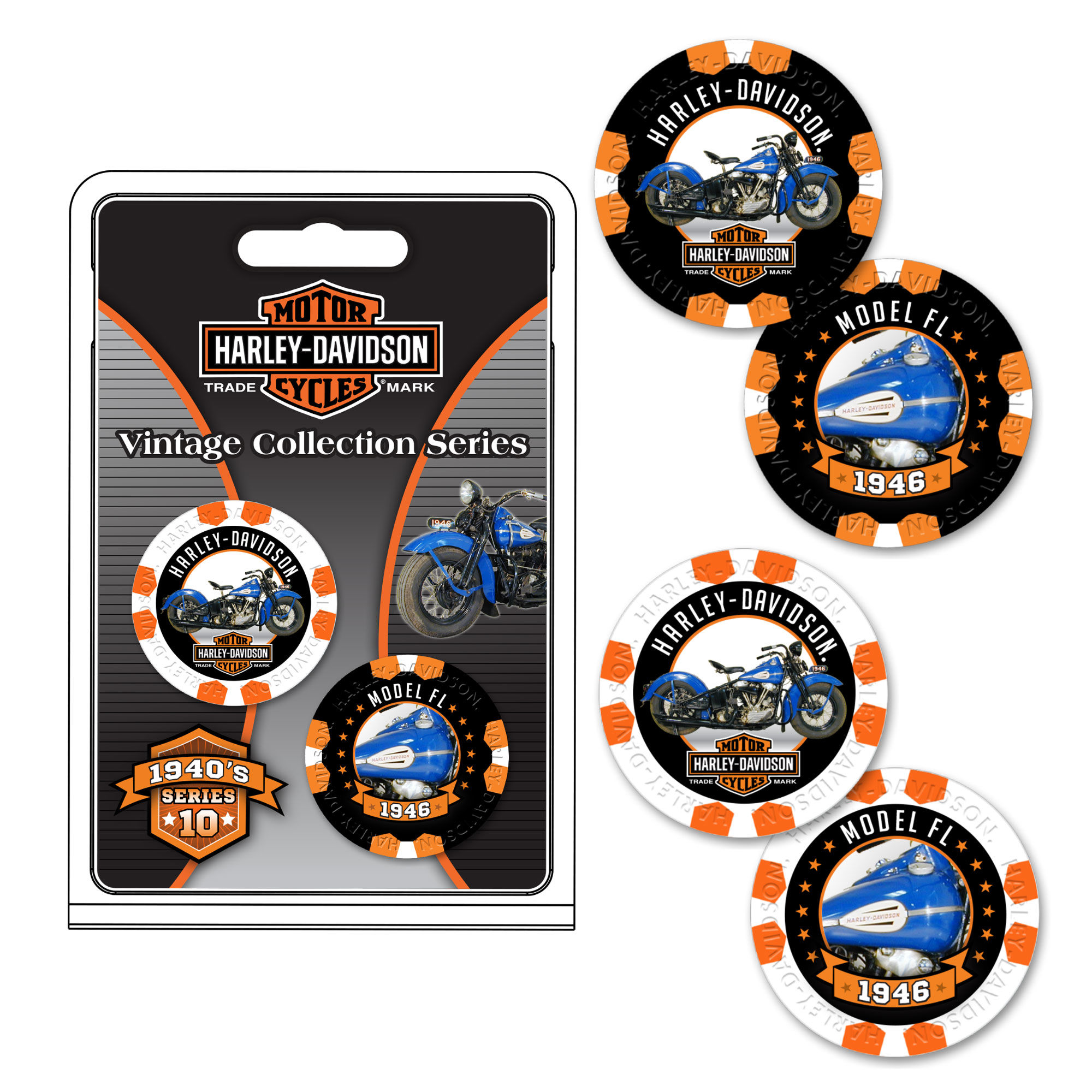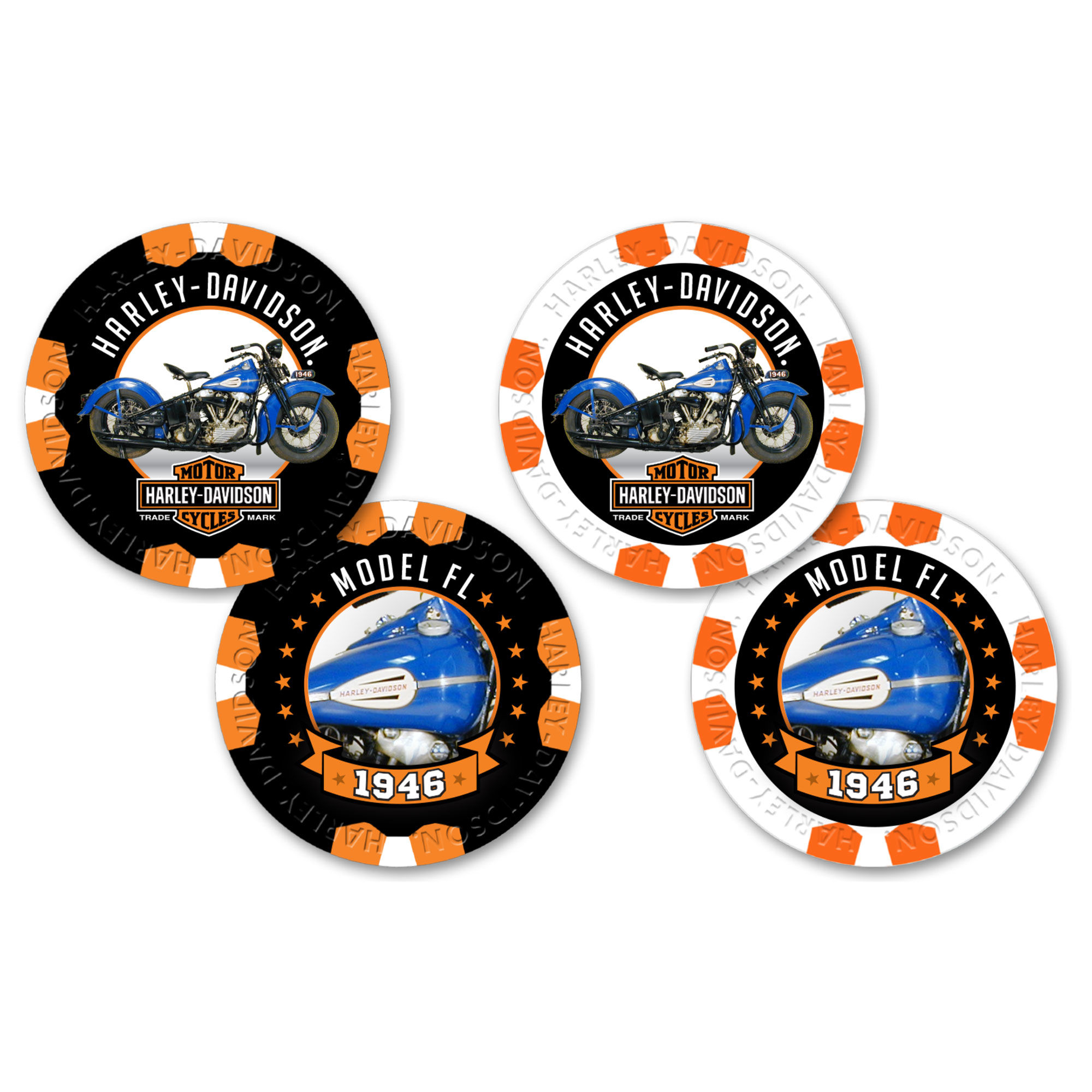 Great collector’s item featuring iconic motorcycles from the history of Harley-Davidson. 2 collectible chips. H-D® embossed 11.5-gram full color chip. Model FL 1946 Historic motorcycle & engine.
