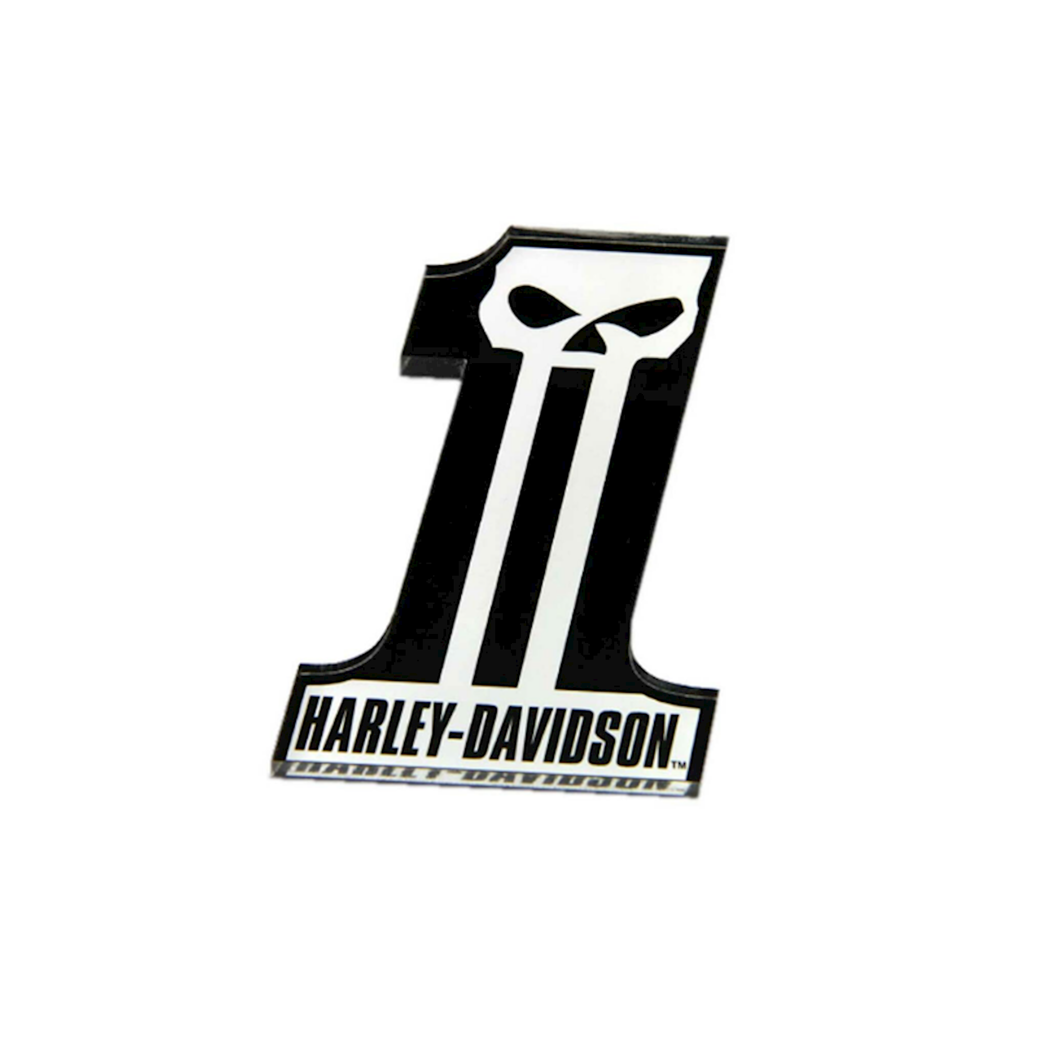 Harley-Davidson® #1 Skull Logo Magnet, 8004965. Iconic cut-out #1 long tooth skull logo. High-quality hard sided acrylic magnet. Strong magnetic backing. Size: 3.25" x 2". Great for a fridge or a tool box!