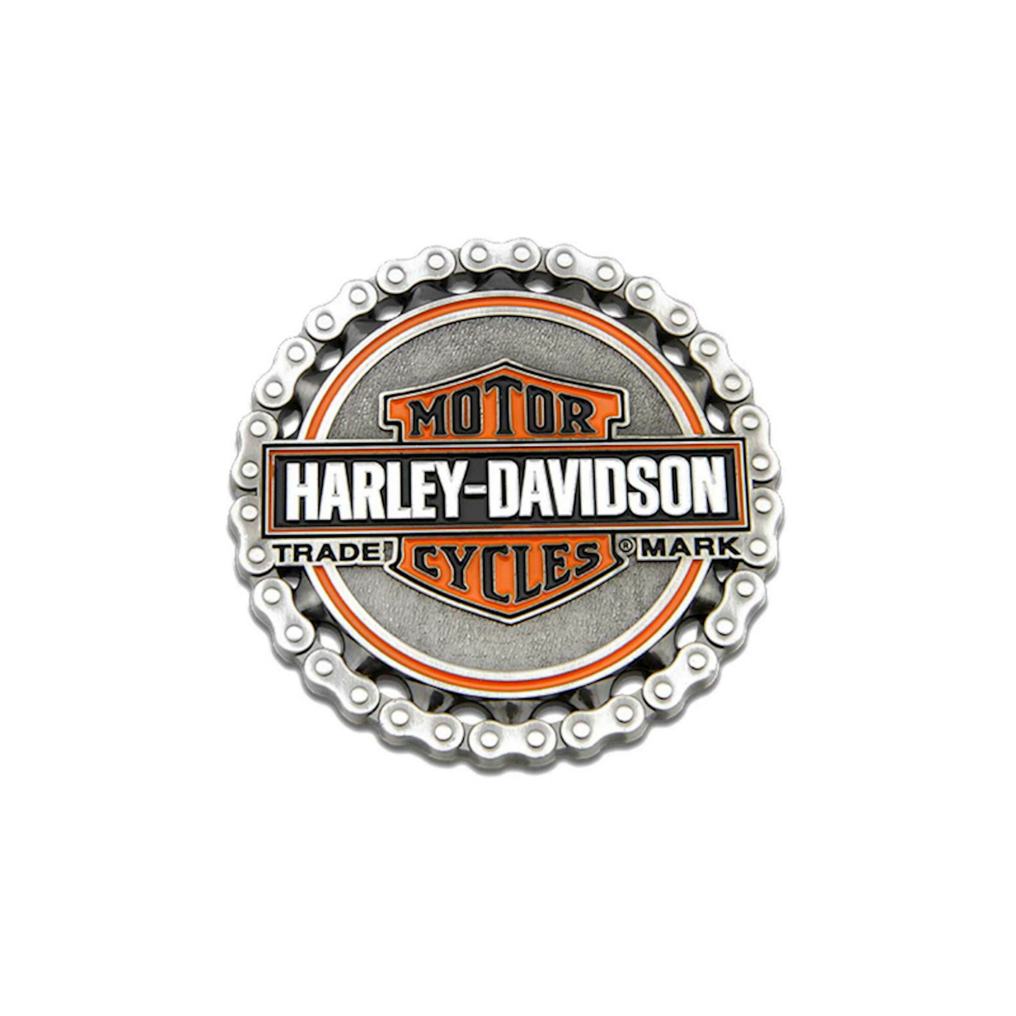 Harley-Davidson® Trademark Chain Heavy-duty Magnet, 8008529. Strong & Durable magnet. This heavy-duty magnet is constructed from pure metal with strong magnetic backing. Decked out with a classic engraved Bar & Shield logo surround by a sculpted biker chain. Size: 3" x 3". Great for a fridge or a tool box!