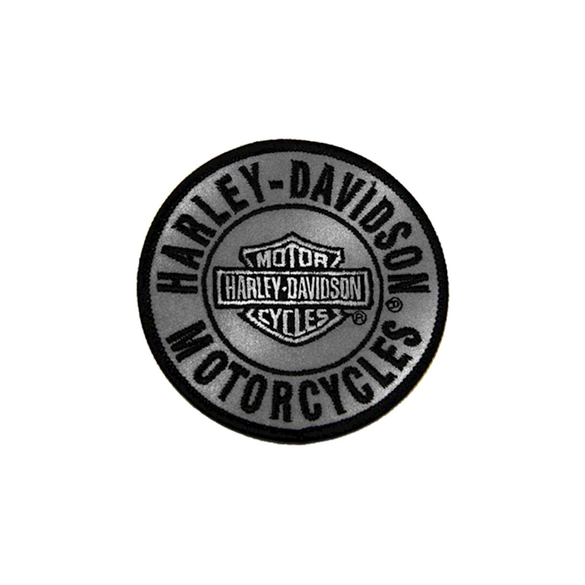 Harley-Davidson® 3" Reflective Round Patch, 8011819. High-quality embroidered Harley-Davidson® script with an iconic Bar & Shield logo on a reflective background. Sturdy black woven trim that will hold up ride after ride. X-small size patch, Size: 3". Sew-on patch. Great looking patch to be sewn on your vest or jacket.