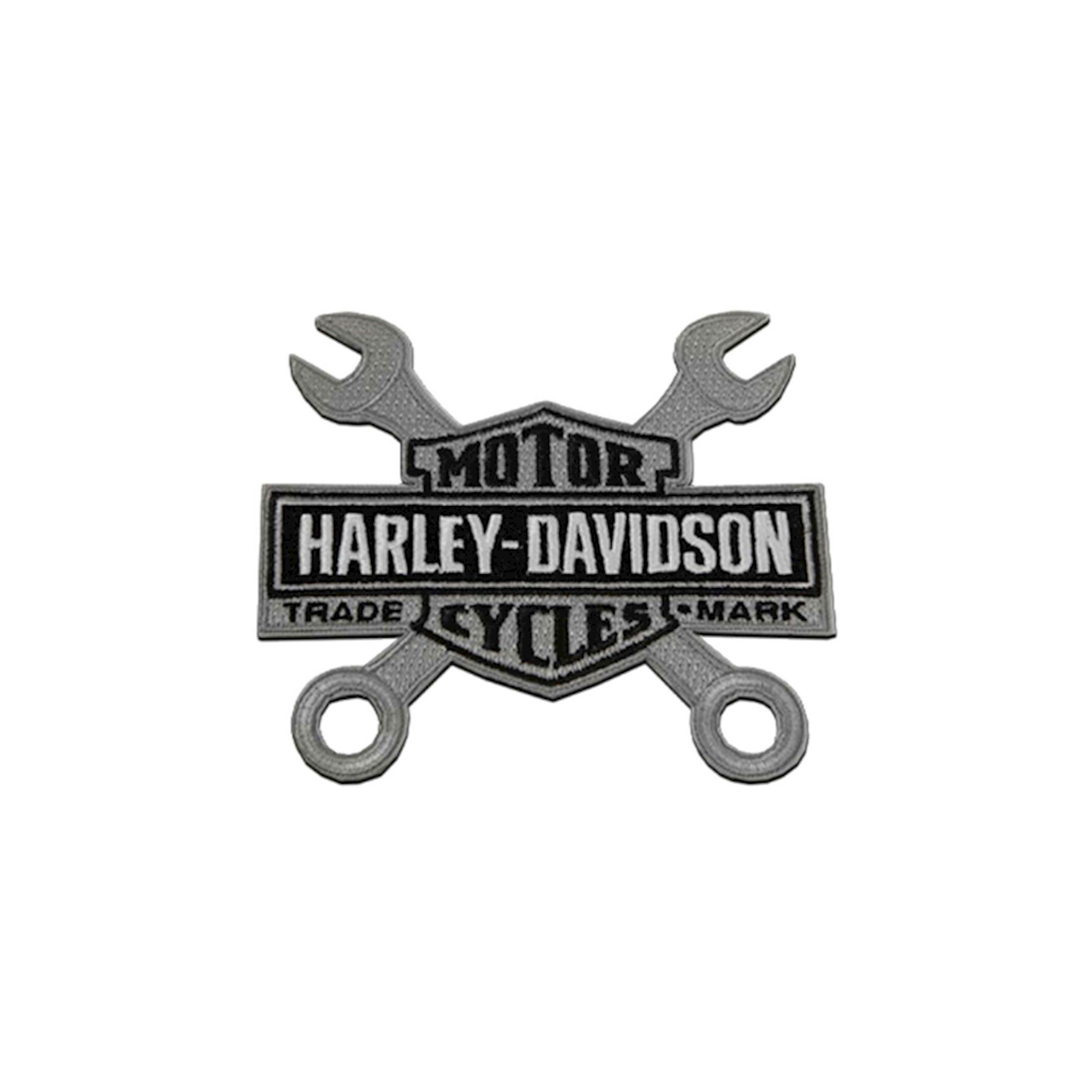 Harley-Davidson® 4" Wrenches Bar & Shield Logo Patch, 8011888. High-quality embroidered iconic Bar & Shield logo framed with crosses wrenches. Sturdy light gray woven trim that will hold up ride after ride. Small size patch, Size: 4" x 3.6". Sew-on patch. Great looking patch to be sewn on your vest or jacket.
