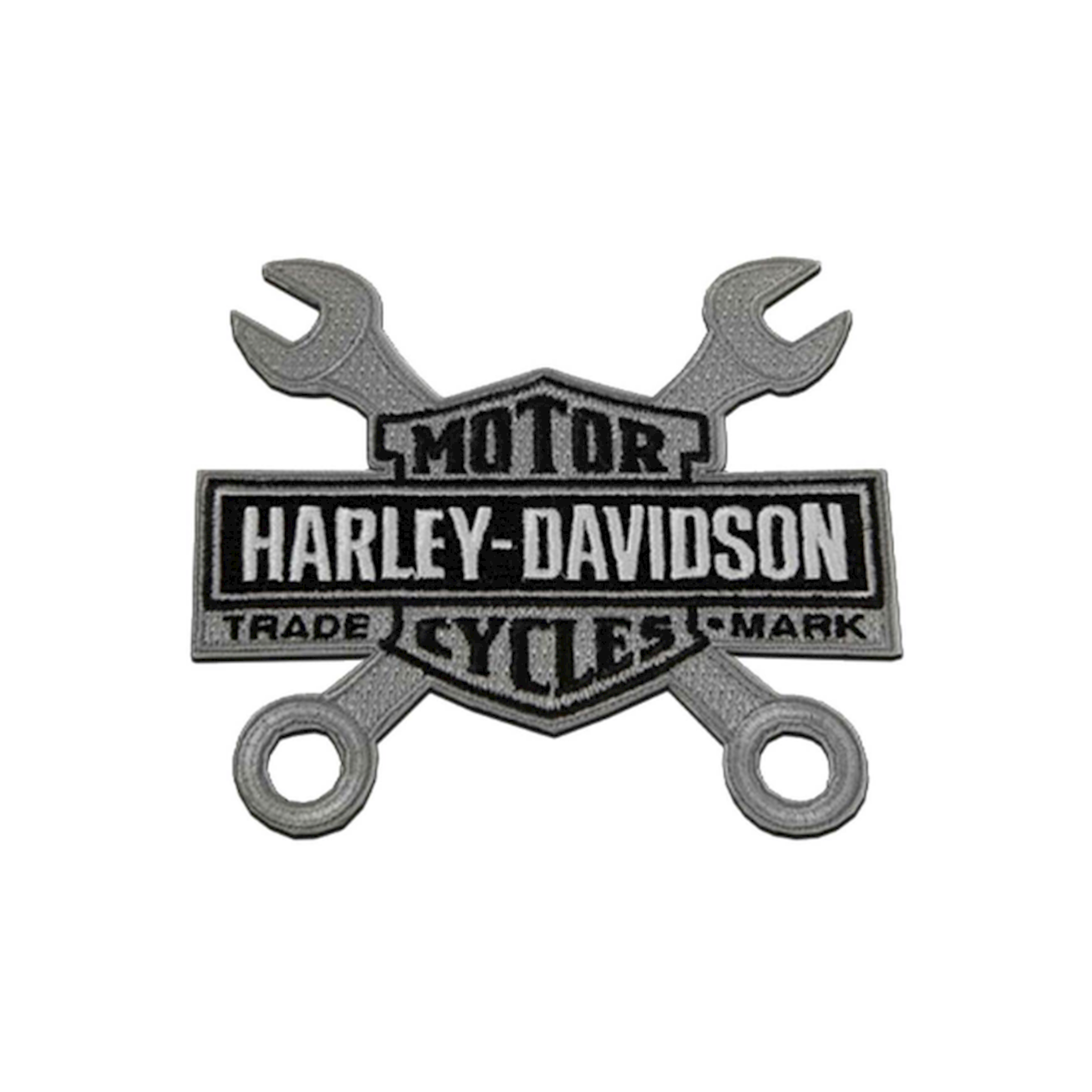 Harley-Davidson® 8" Wrenches Bar & Shield Logo Patch, 8011512. High-quality embroidered iconic Bar & Shield logo framed with crosses wrenches. Sturdy light gray woven trim that will hold up ride after ride. Small size patch, Size: 8" x 7.18". Sew-on patch. Great looking patch to be sewn on your vest or jacket.