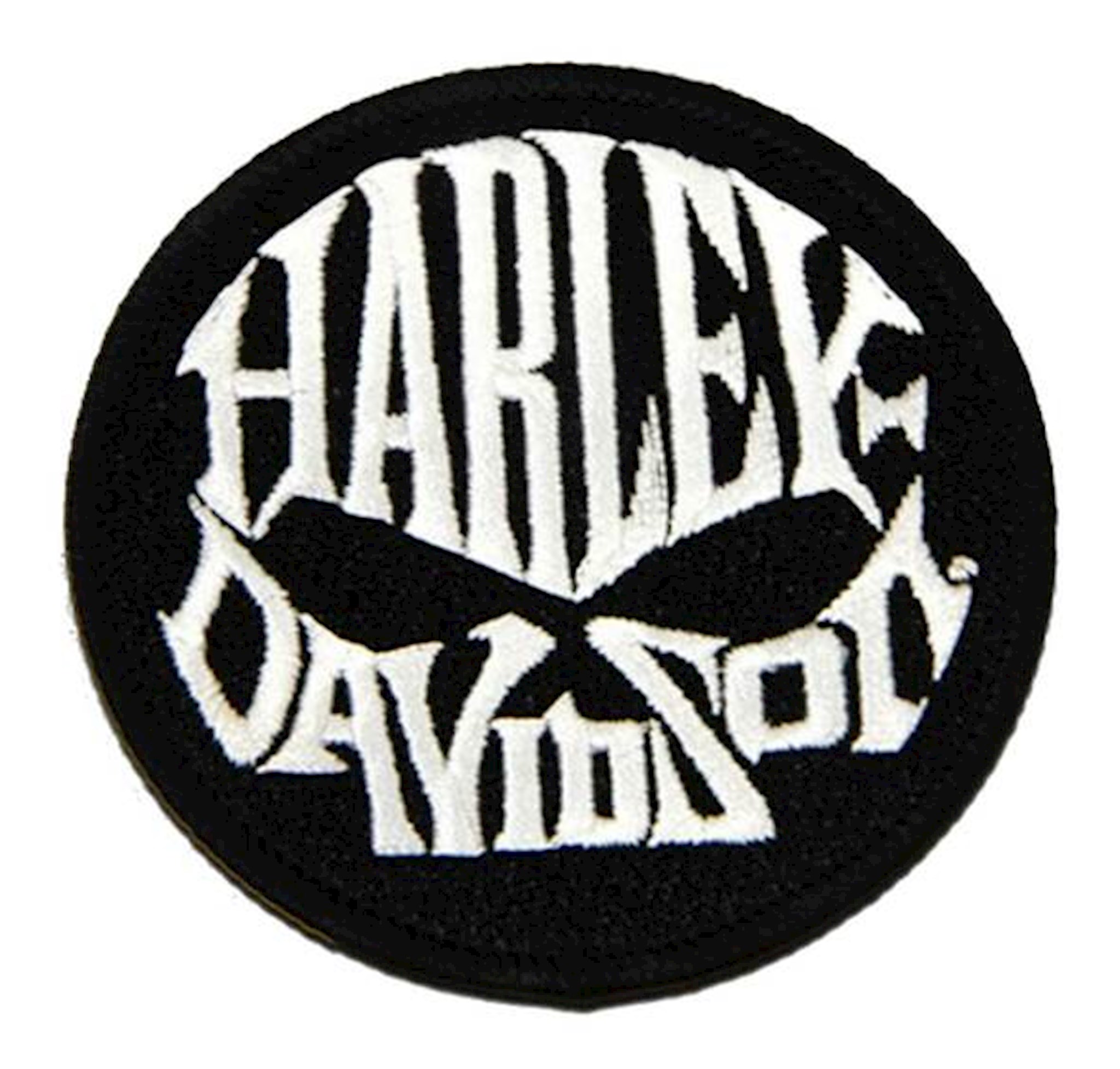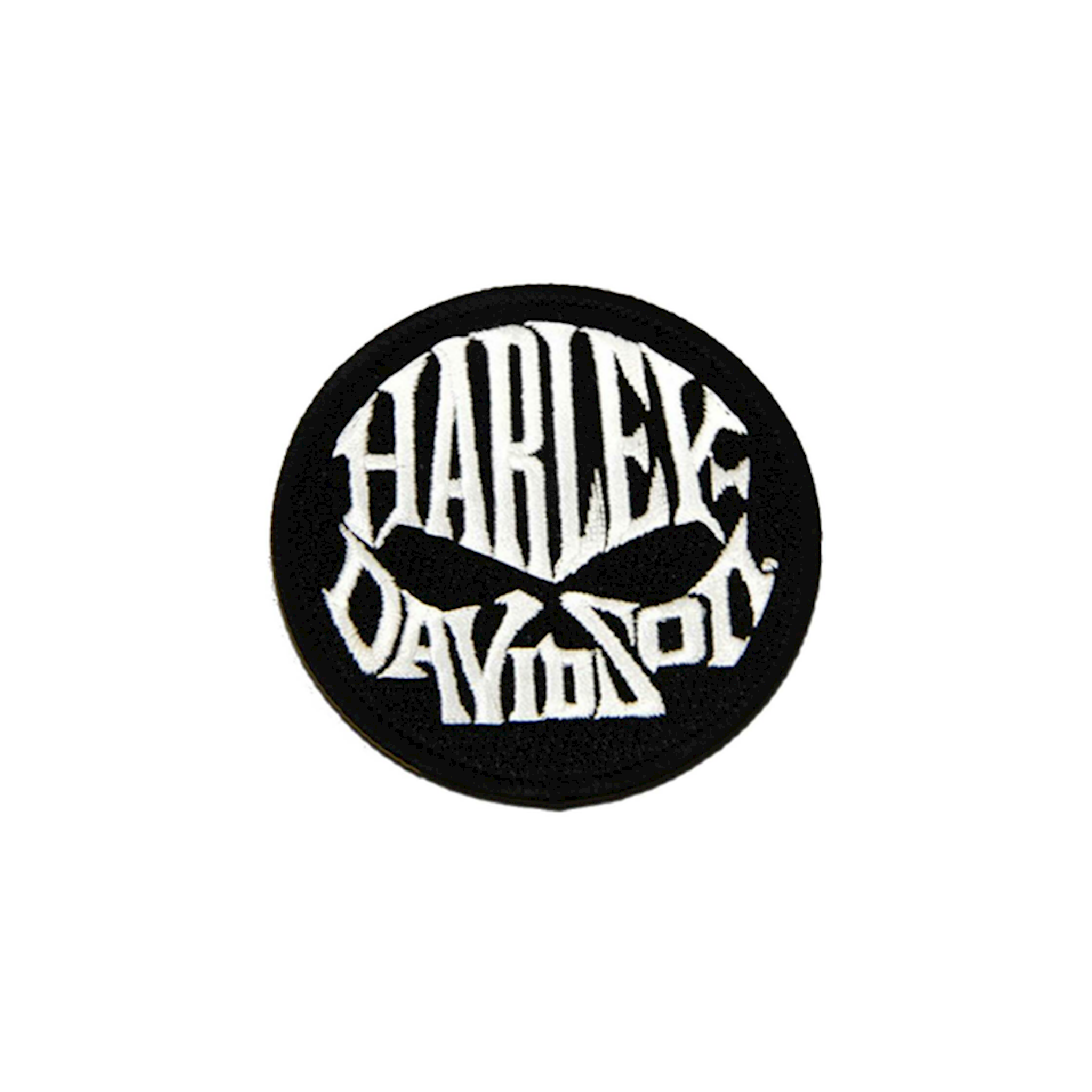 Harley-Davidson® 3" Skull Text Round Patch, 8011918. High-quality embroidered white Harley-Davidson® script shaped into an iconic Willie G Skull logo. Sturdy black woven trim that will hold up ride after ride. X-small size patch, Size: 3". Sew-on patch. Great looking patch to be sewn on your vest or jacket.