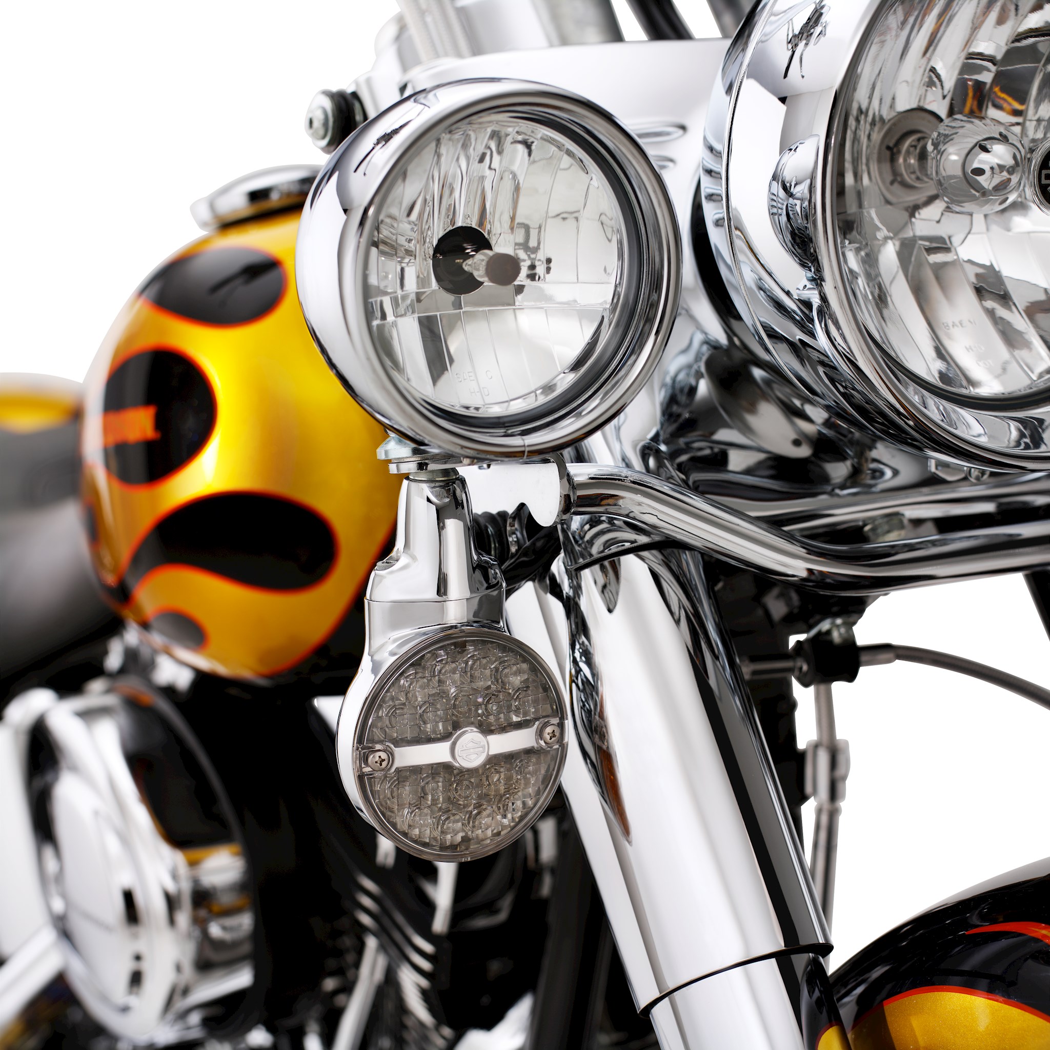 Beautiful signature light for models with Flat Lens Turn Signals. These turn signals feature fast-acting, extra bright LEDs set in low-profile die-cast chrome housings. In the front, the lights function as running light and directional indicators. In the rear, the lights function as running light, brake light and directional indicators. The front amber lights are available in your choice of smoked or amber lens and the red rear lights are offered with either smoked or red lens. Installation does not require installation of a "control box" or load equalizer and the turn signals attach directly to existing wiring without cutting or splicing. Featuring pillow-style optics, a horizontal chrome band and a Bar & Shield medallion, these signals are the perfect match for the available LED Tail Lamps. Sold in pairs. Fits '01-later FLSTC and '01-'13 Touring models equipped with flat lens turn signals.