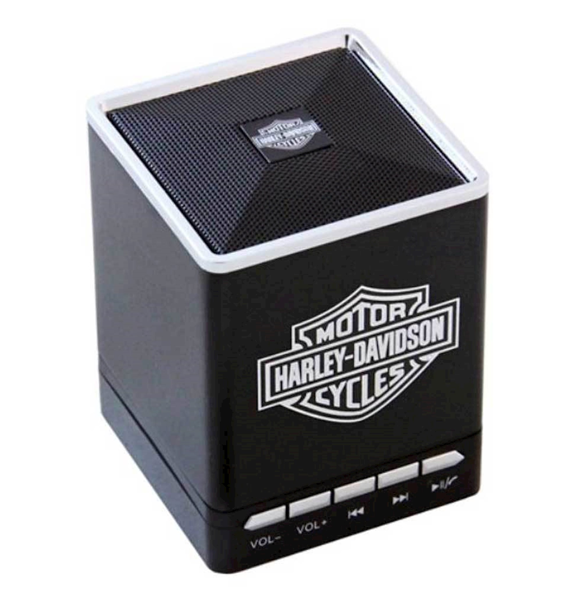 Harley-Davidson® Bar & Shield portable speakers. Small size, BIG sound! The fuse Bluetooth Speaker delivers rich, premium sound in a compact palm-sized portable design. Control your music with your phone or the speaker unit's side panel: volume up/down, previous/next, play/pause. With the unique hands-free speakerphone feature you can also answer, hang up, or ignore calls at anytime. Our Bluetooth speaker works with any Bluetooth enabled phone, tablet,or mobile device. Our portable speaker comes with a fully rechargeable Lithium-ion battery that delivers up to 5 hours of continuous play, a micro USB cable and a 3.5mm auxiliary cable. Wireless Range up to 33ft. Great for the office, home, on the road, or any situation where music and access to your phone is a must!