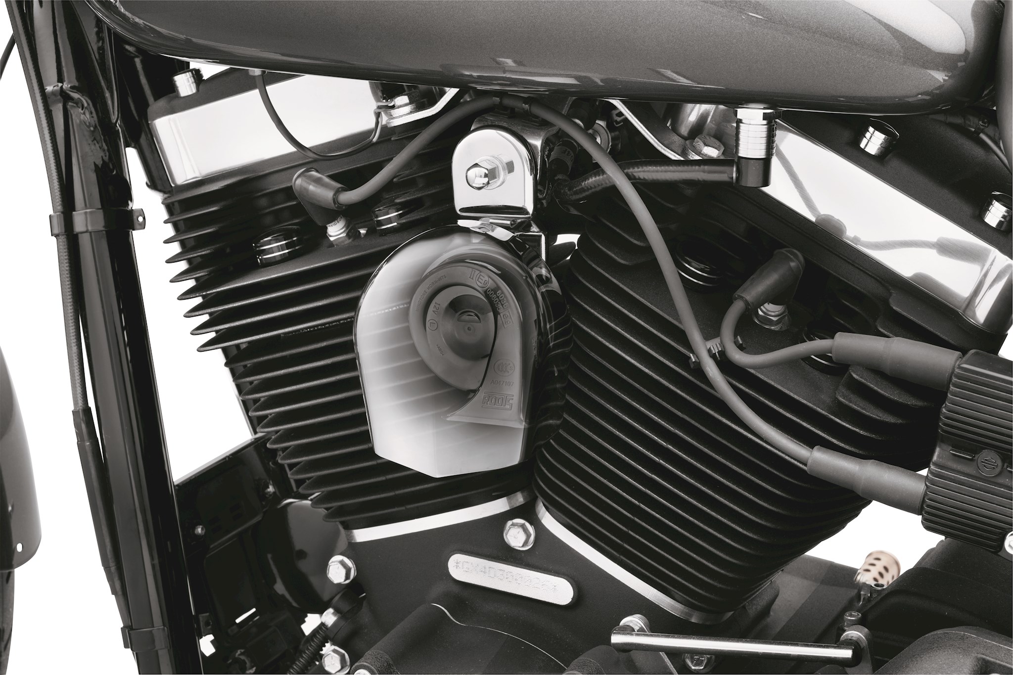 Fits '91-later VRSC, XL1200C, XL1200V, Dyna, Softail (except FLSTS, FLSTSC, FXCW, FXCWC, FXS, FXSB and FXSBSE), Touring and Trike models. Stock on '14 models equipped with a side-mount horn.