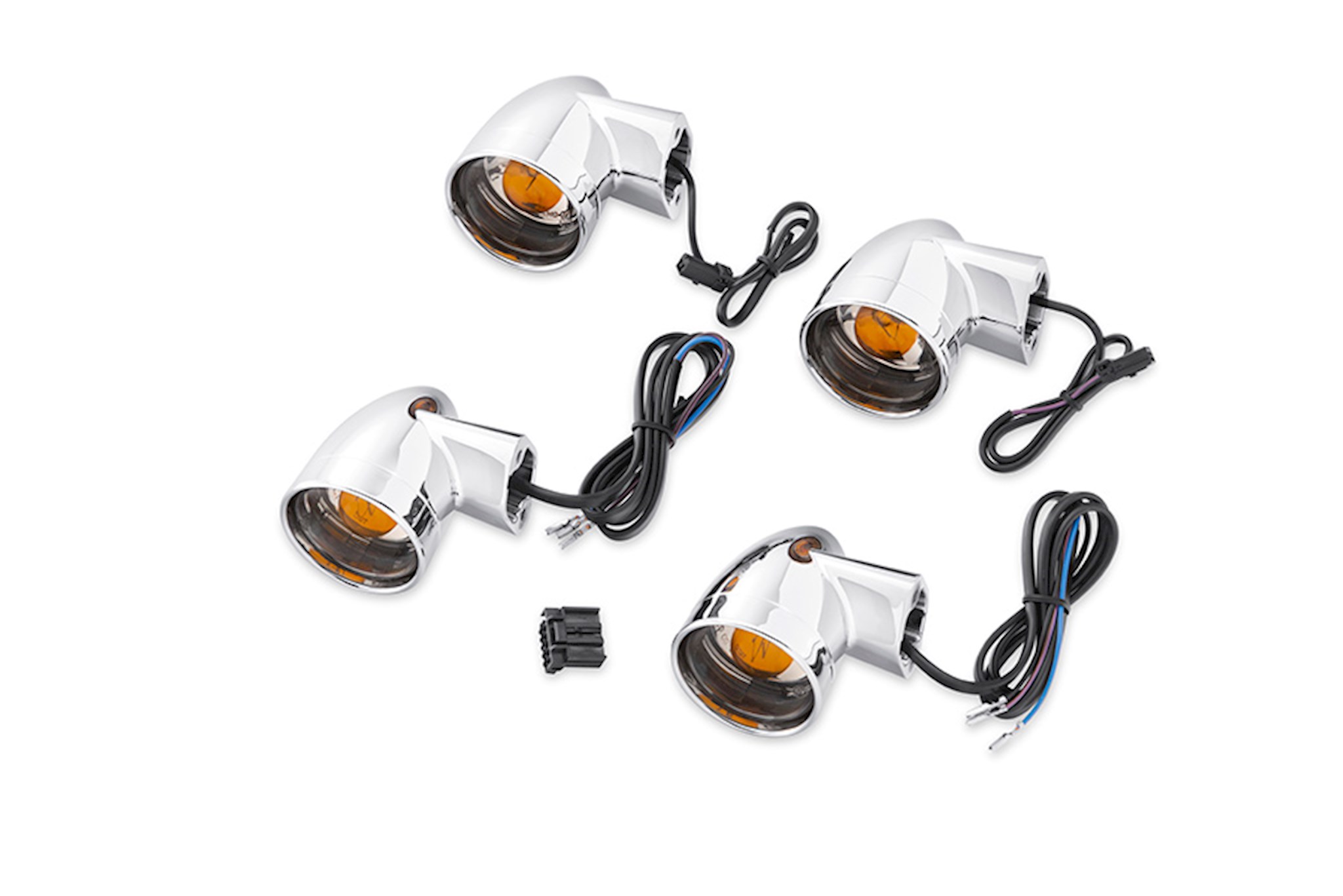 Streamline the styling by replacing the front and rear flat lens turn signal lamps with sleek bullet signals. The bullet-shaped housings attach to the Original Equipment turn signal mounting brackets. The kit includes two front and two rear turn signal assemblies and the necessary hardware for installation. Fits '94-'13 FLHT, FLHTC and FLHTCU, '94-later FLHR and FLHRC, '98-'03 FLTR, '96-later FLSTC and '93-'96 FLSTN models.