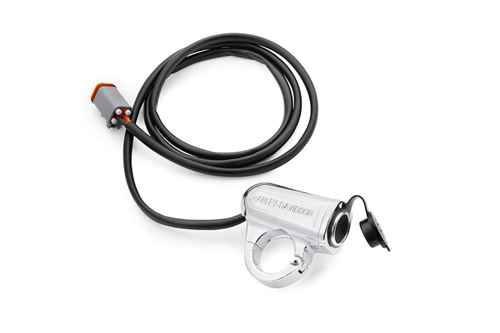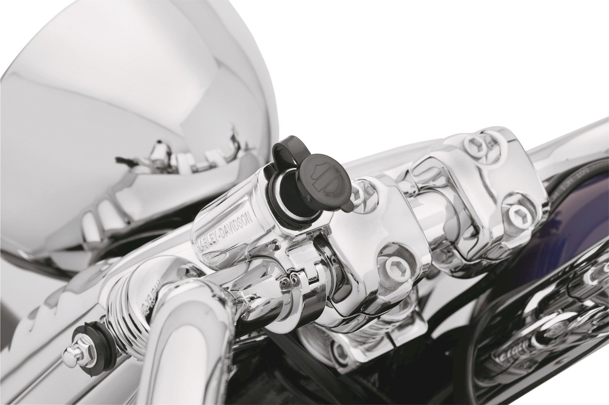 Ideal for powering handlebar-mounted accessories, this elegant cast housing securely clamps to the handlebar to keep your power port within easy reach. Fits '12-later Dyna, '11-later Softail and '14-later Road King models with 1-1/4" diameter handlebars.