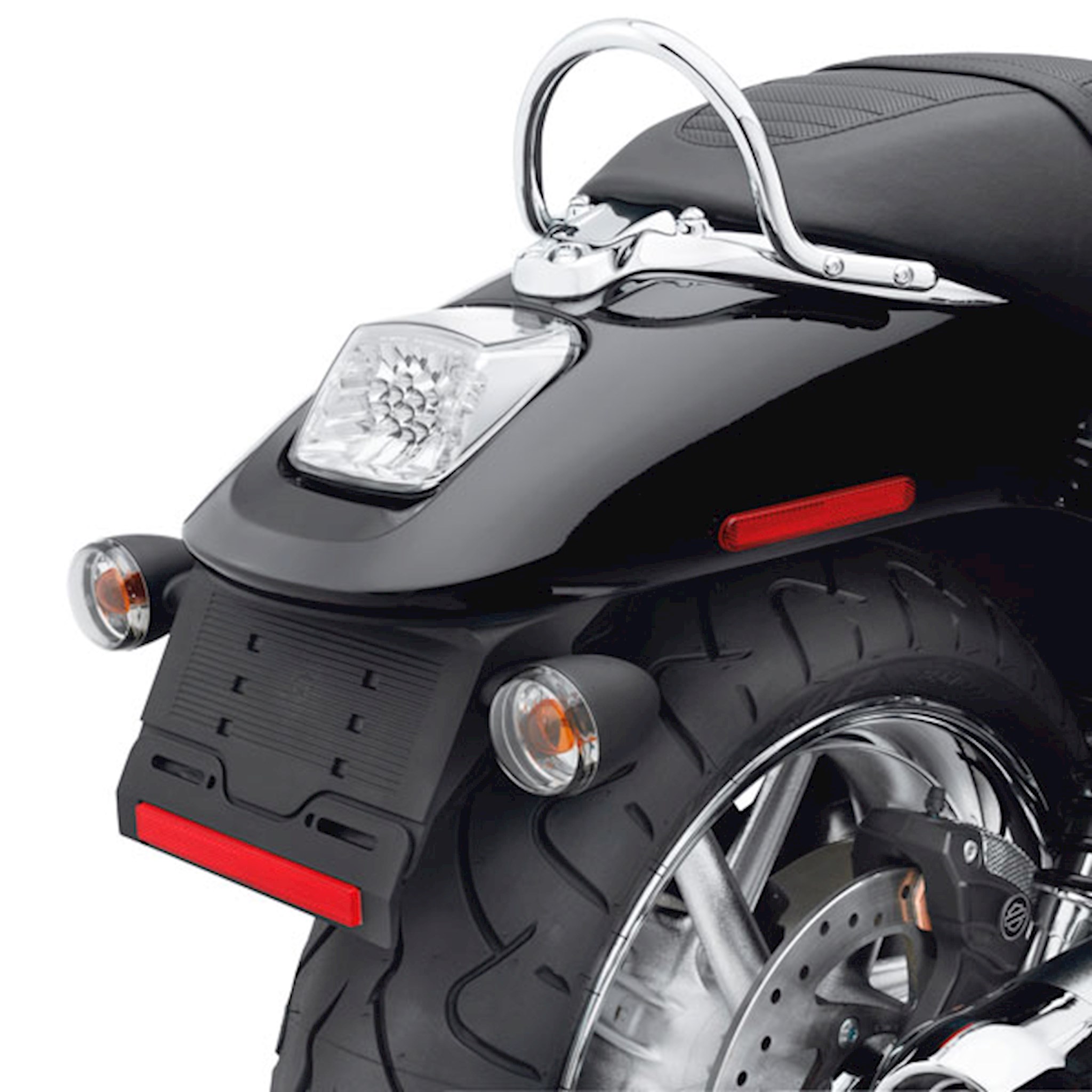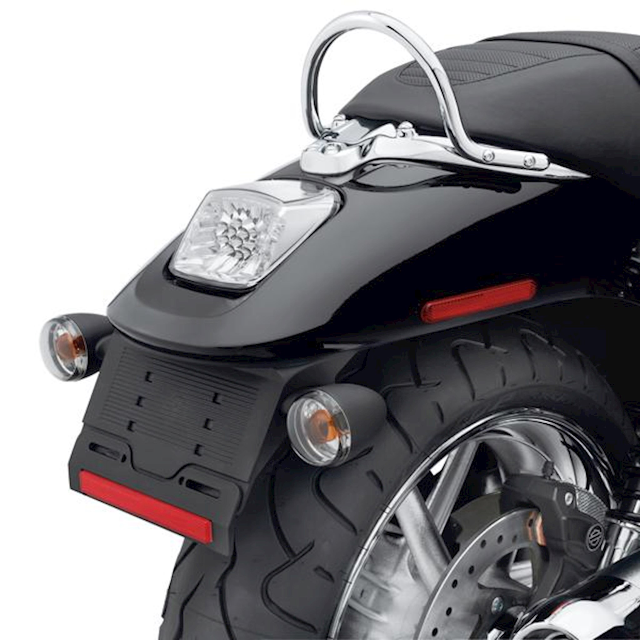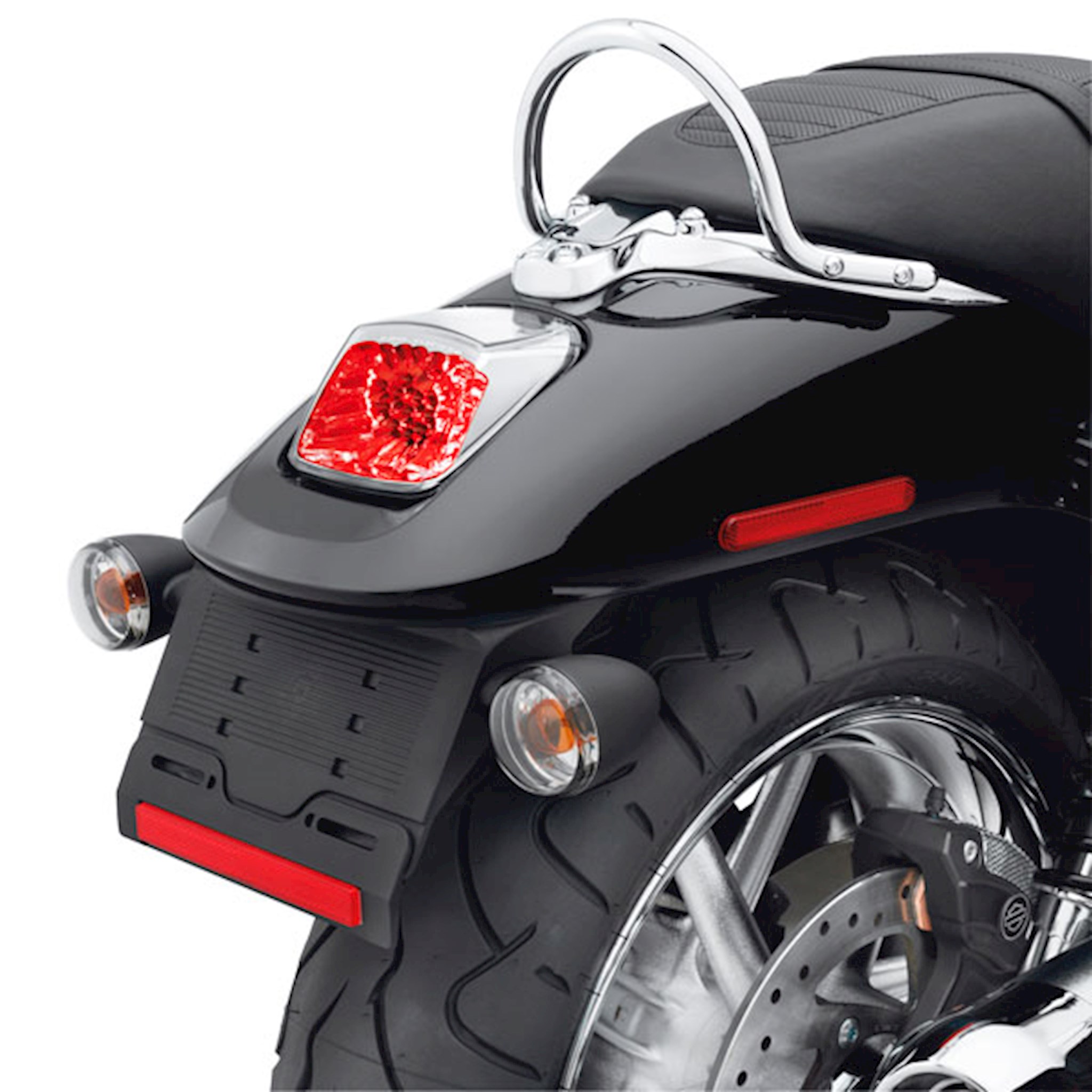Function and style in one. Twenty-three brilliant red LED lamps are set in a mirror-finished chrome inner reflector. The "diamond cut" facets shape and direct the light and add a style all their own. Available with a red or clear outer lens, the installed lens adds a red metallic or chrome finishing touch to the rear fender. Featuring easy plug-in connection to the Original Equipment wiring harness. Meets DOT and TUV requirements. Fits '02-'11 VRSC models (except VRSCF and '12-later VRSCDX) and '00-'07 FXSTD models.