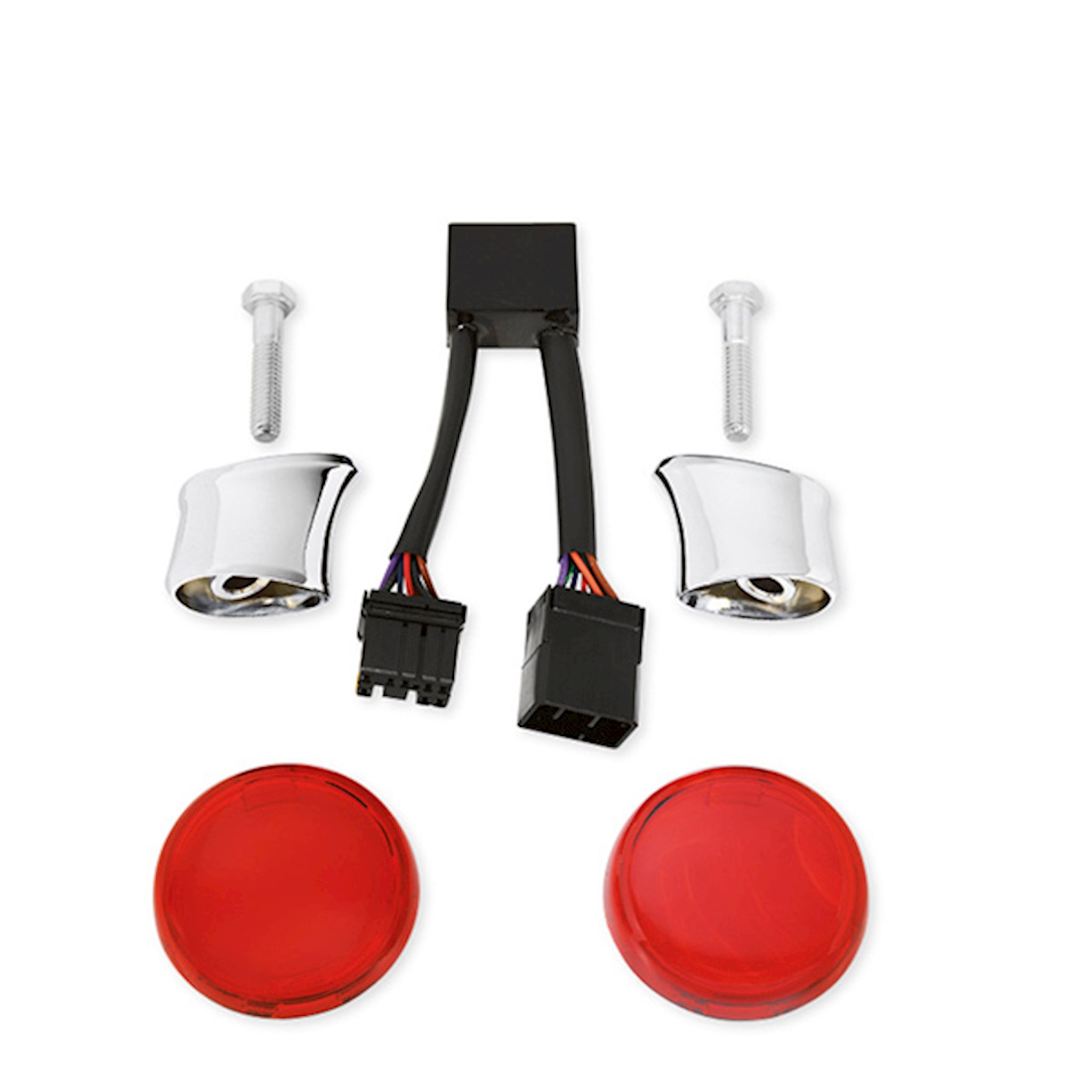 Turn signal module adds an auxiliary brake light and running light function to your existing turn signals for auxiliary rear lighting. Red lenses glow when the headlamp is on and increase in intensity when brakes or turn signals are activated. Easy to install, the kit simply plugs into your existing wiring harness. Red turn signal lenses are included. Meets DOT requirements.