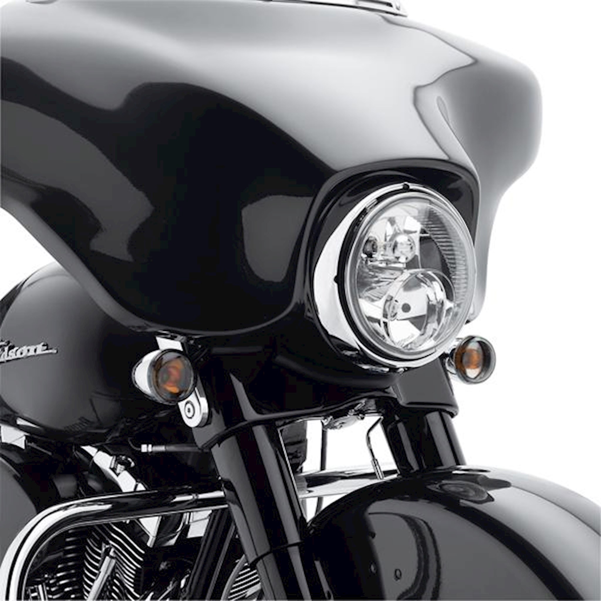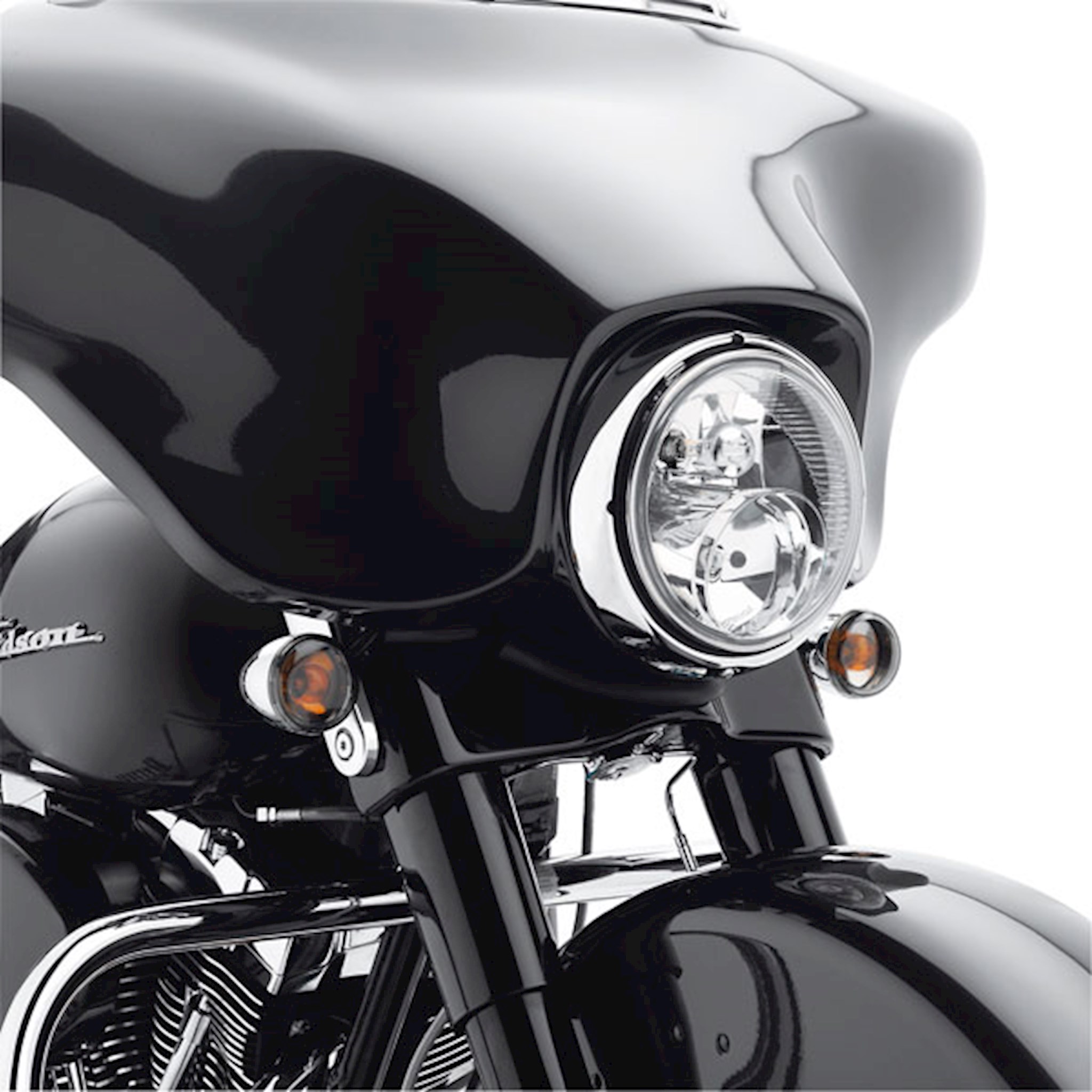 Add the lean, stripped-down look of the FLHX models to your Electra Glide® or Road King® motorcycle. Complete kit replaces the Original Equipment passing lamps and flat lens turn signal mounts with streamlined bullet-style turn signals. The chrome-plated brackets serve as stylized mounting points for the turn signals and conceal the wiring for a clean, custom appearance.