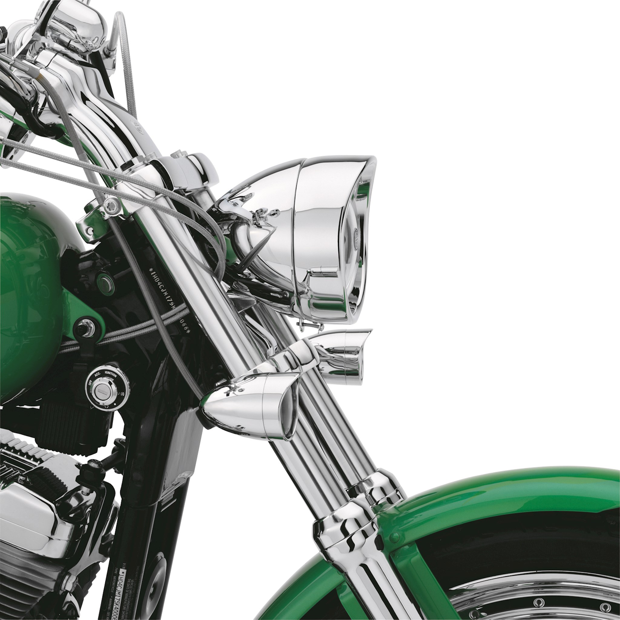 These chrome-plated Visor Style Trim Rings recess the headlamp into the housing and add a traditional "eyebrow" design to the headlamp shell. The trim ring stretches the profile of the bike for a long, lean appearance. Add matching Visor Style Passing Lamp and Turn Signal Trim Rings for a true custom look.