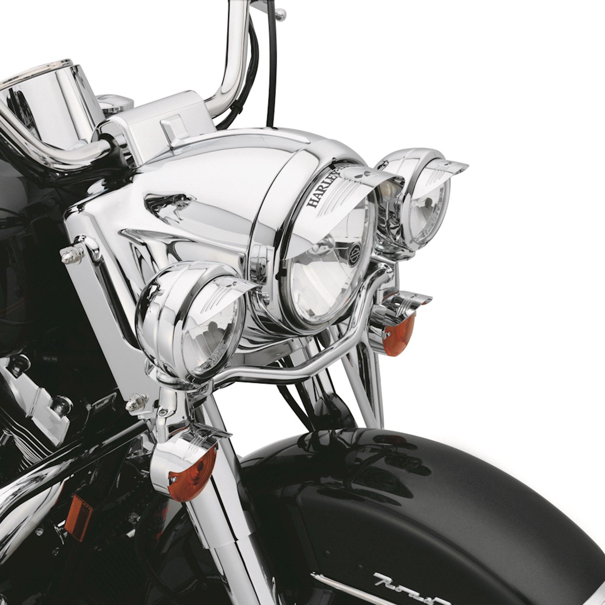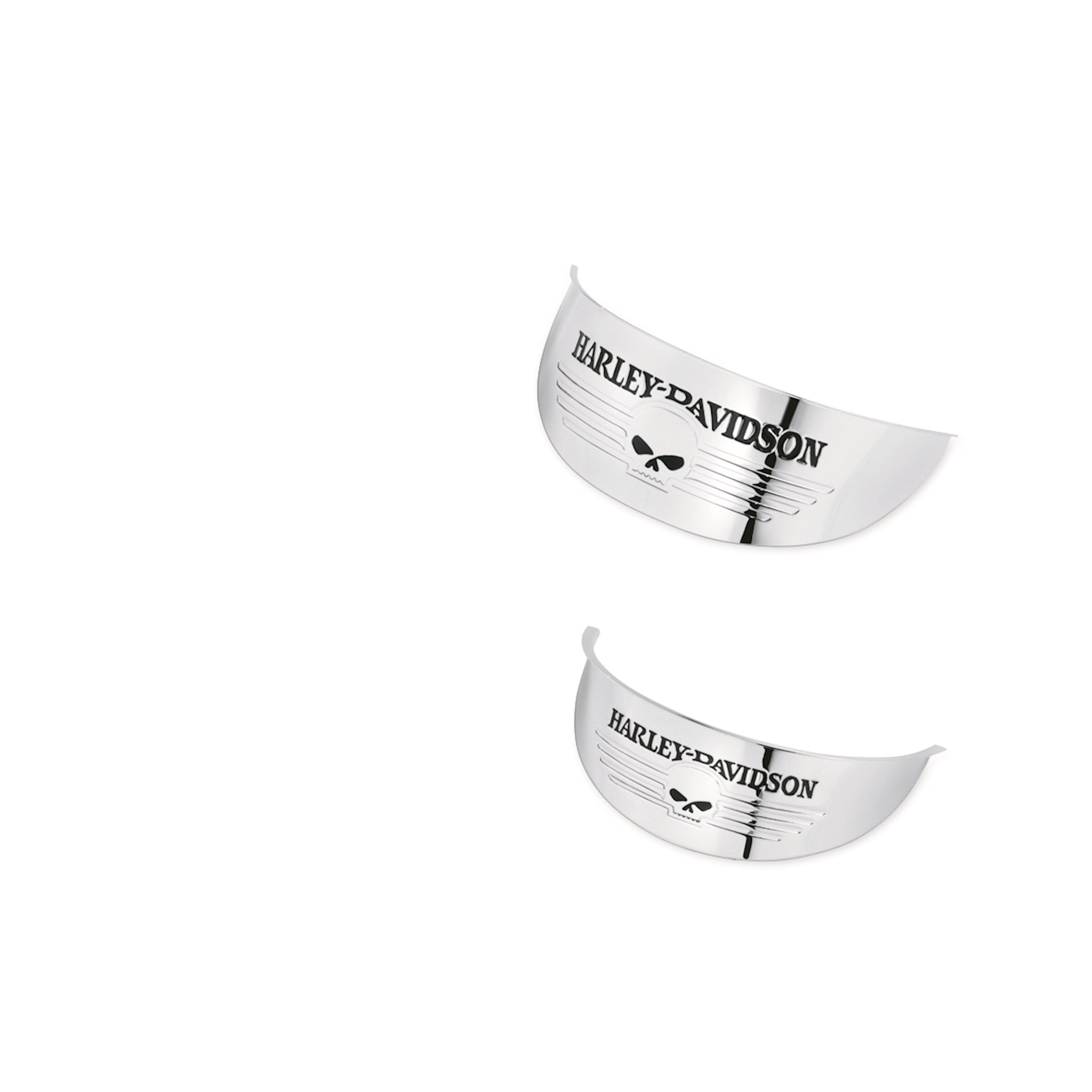 Add a little attitude to your ride. Styled to complement Harley-Davidson® Skull accessory items, the menacing raised skull with black-filled eyes leaps from a field of chrome. This complete collection of Lamp Visors dresses your bike for a true custom look.