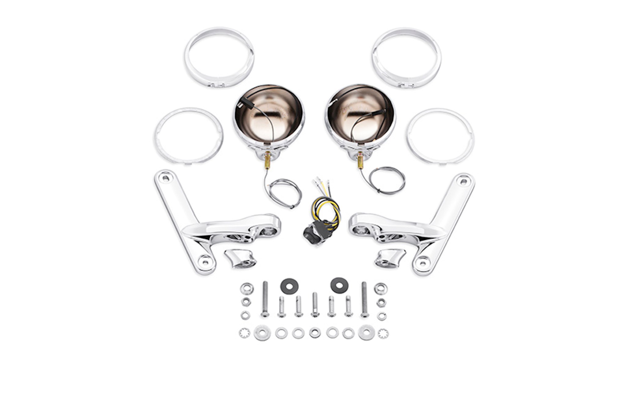 Shaped by the wind, this Auxiliary Lighting Kit follows the contours of the triple tree and headlamp shell for a custom look. The elegant cantilever brackets serve as stylized mounting points for the passing lamp and turn signal housings and eliminate the cross brace and flat side supports of traditional auxiliary lamps. Fits '06-'13 FLHX models. Kit includes passing lamp housings, retaining rings, mounting brackets, auxiliary lamp switch and hardware. Auxiliary Lamp Bulbs and Bullet Turn Signal Kits sold separately.