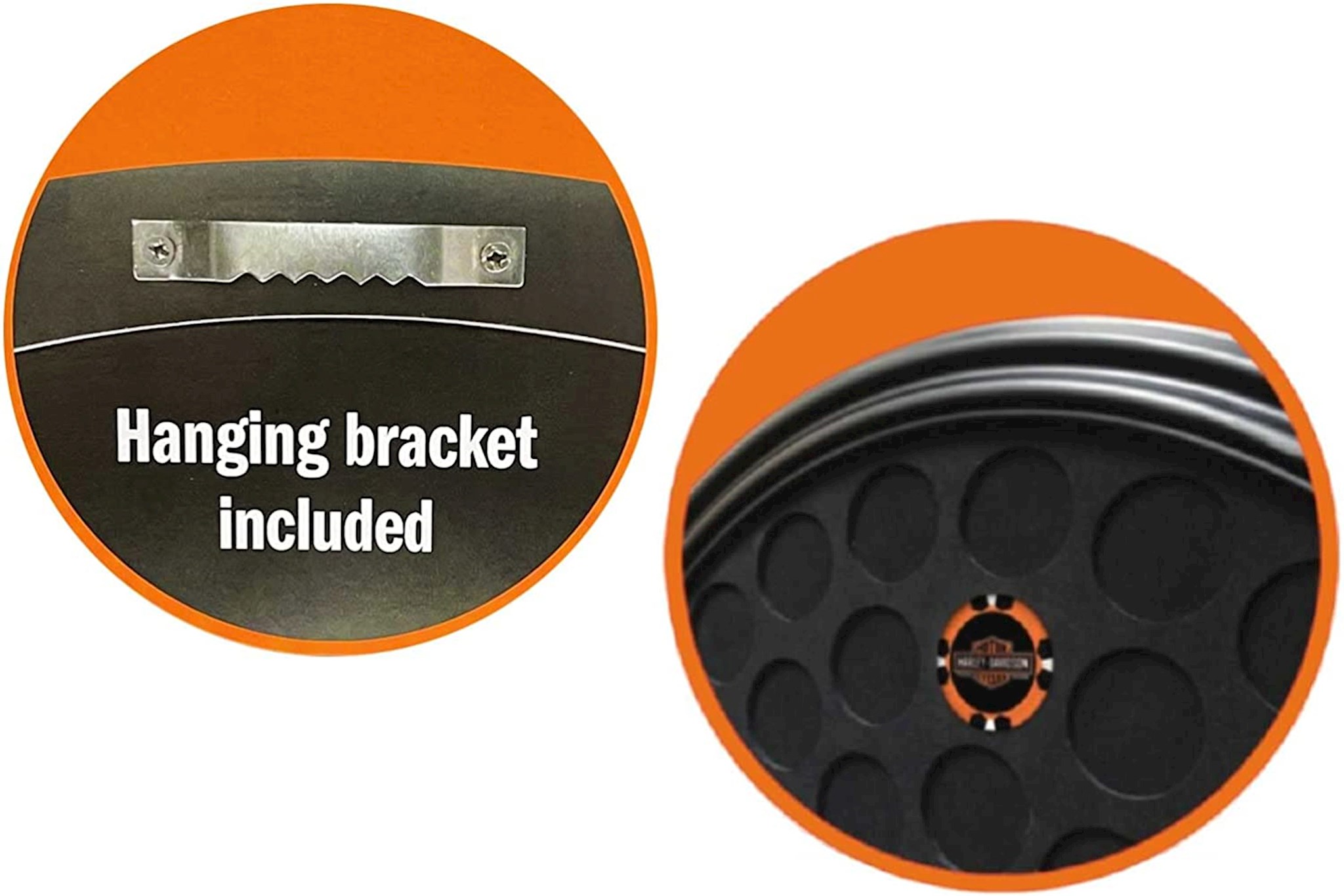 Harley-Davidson Trademark Round Poker Chip Frame, 6988. Mounts on your wall, great way to show off your collection. Its elegant round shape blends well in any decor throughout your home. It features the renowned Trademark Bar & Shield logo imprinted in center. Traditional black molding frame with a plexiglass on front to protect your chips. Holds 47 collectible H-D chips. (Chips are not included) Velour-felt slots holds chips securely. Specially cut molding design with black finish. Includes handing bracket on back. Size: 18".