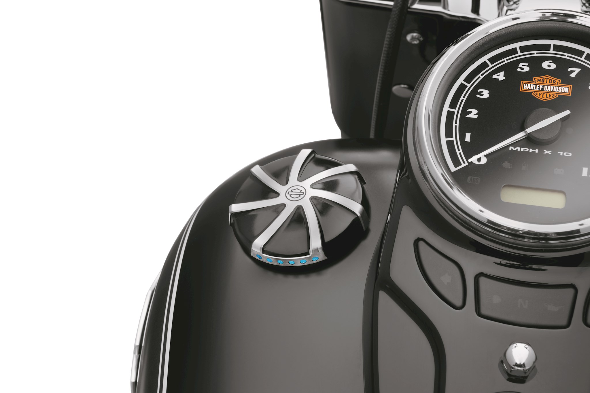 This low-profile fuel gauge replaces the analog readout with bright LED lamps. The six edge-mounted LED lamps glow blue when the tank is full and extinguish one by one as fuel is consumed. Plug-in installation without splicing. Photocell automatically adjusts LED brightness for improved visibility in direct sunlight and dims at night to avoid distraction. Fits '09-later Dyna® (except FXD), '08-later Softail® (except FLSTNSE, FXCW, FXCWC, FXS, FXSB and FXSBSE), '08-later Road King® and '15-later Freewheeler® models.