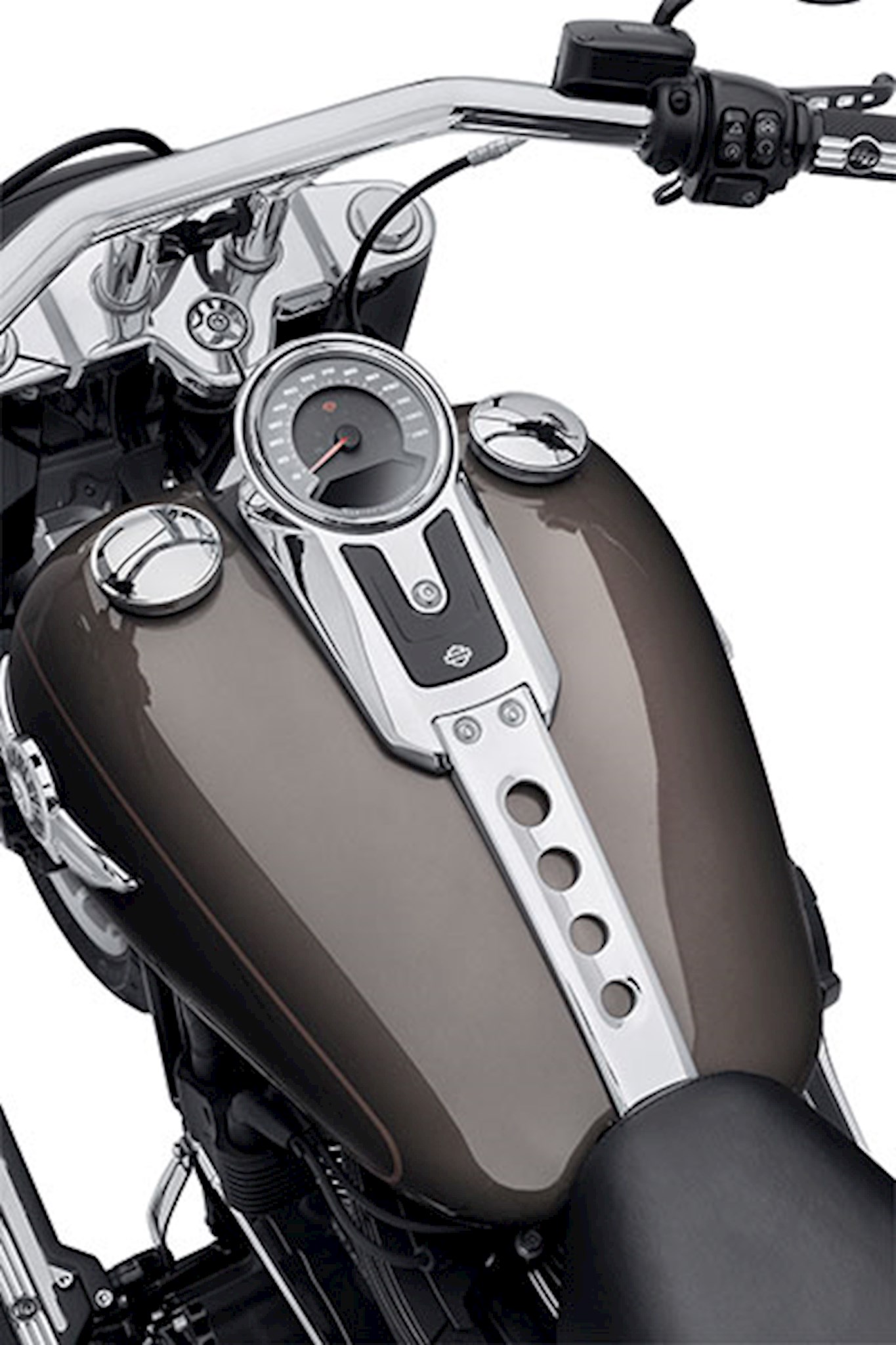 Dress up your ride. Designed in the style of the Fat Boy model’s console with perforated tank strap, this mirror-chrome finished Console Kit includes the major components required to change the black or satin chrome console to a bright custom look. Easy to install, this Chrome Console Kit instantly transforms the view over the tank. Manufactured from Original Equipment components for superior fit and finish, the kit includes polished chrome instrument console, tank strap, console insert and installation hardware.