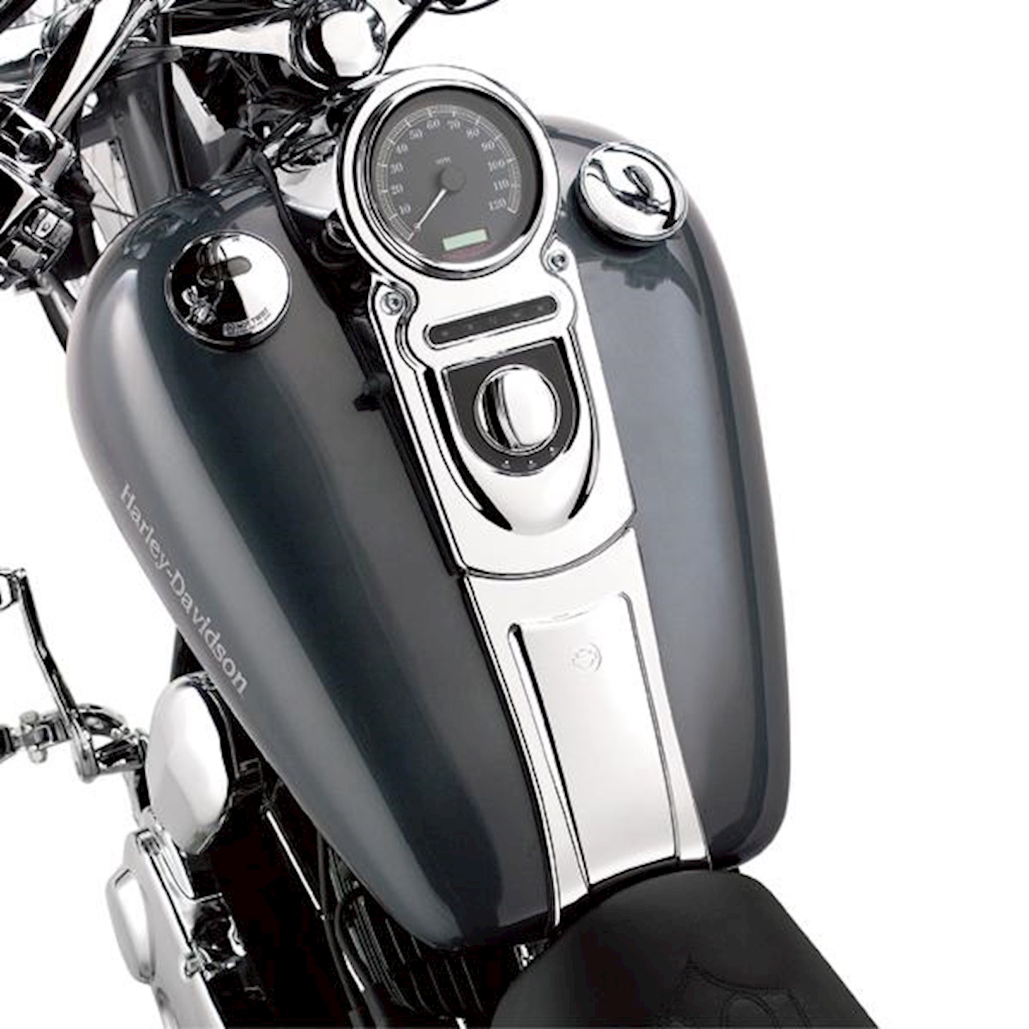 Stretch the lines of your chrome dash panel the full length of the fuel tank. This chrome-plated trim kit continues the lines and finishes of your standard tank panel to the front of the seat. The curving lines and Bar & Shield logo add a custom touch without the expense of a custom tank.