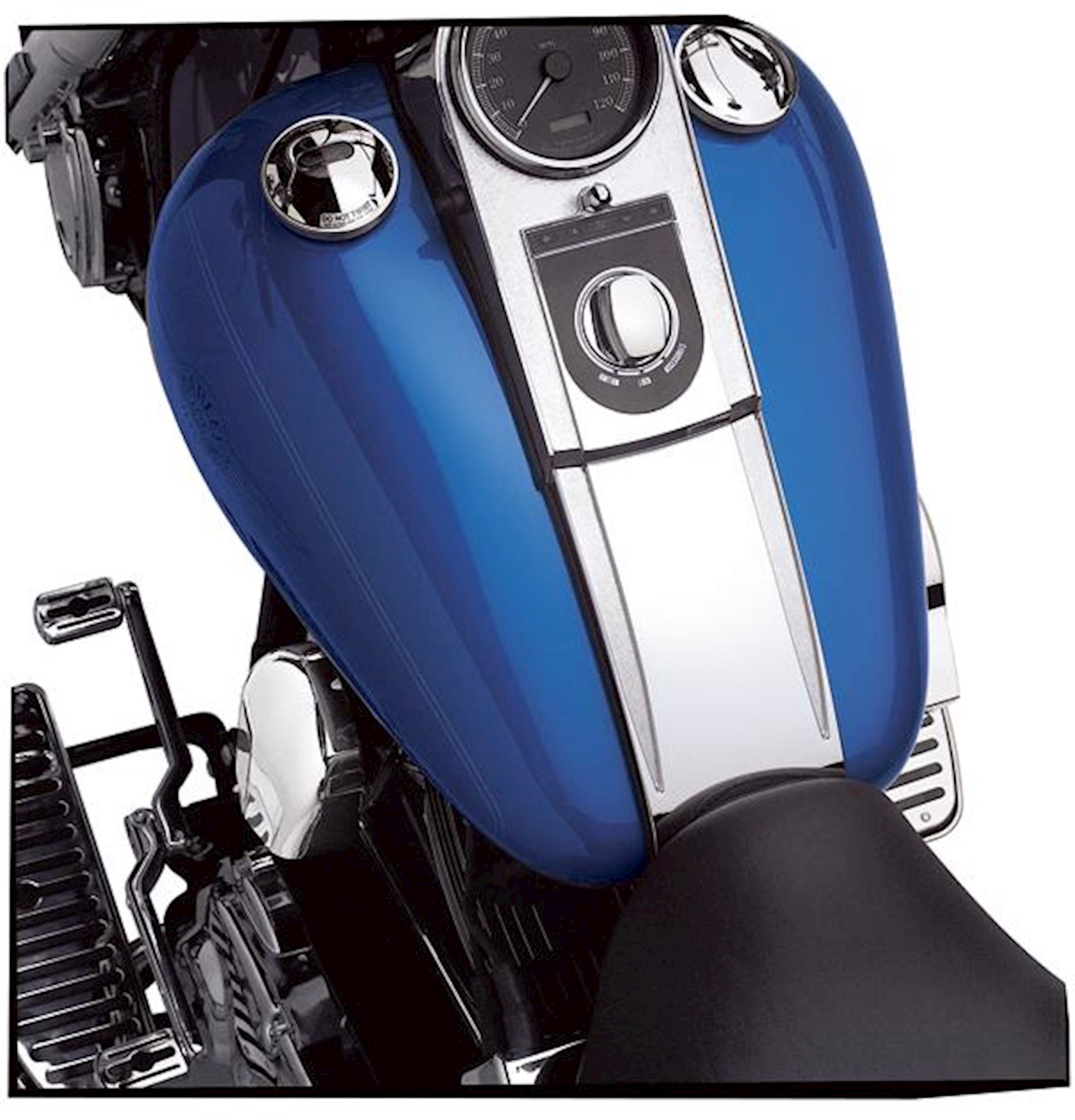 Stretch the lines of your chrome dash panel the full length of the fuel tank. This chrome-plated trim kit continues the lines and finishes of your standard tank panel to the front of the seat. The curving lines and Bar & Shield logo add a custom touch without the expense of a custom tank.
