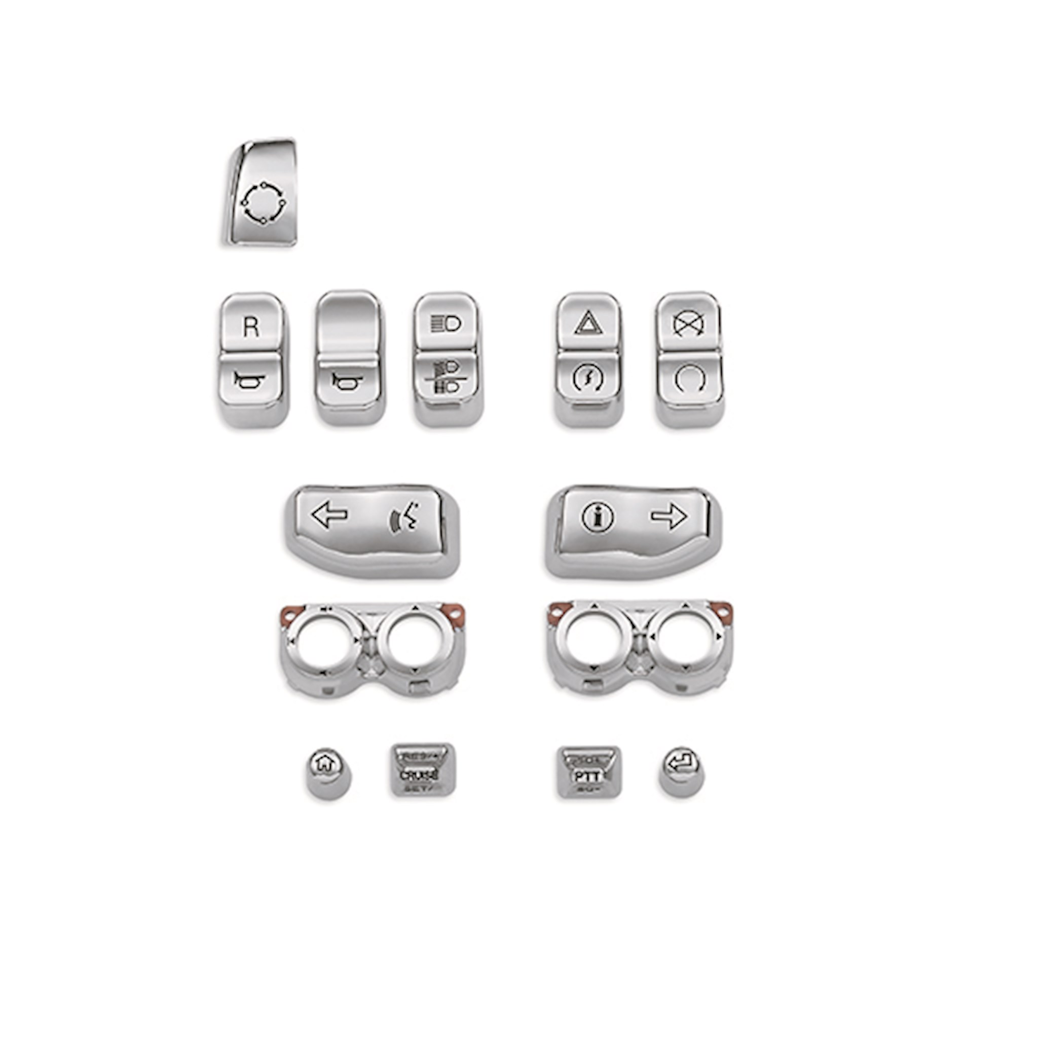 Not satisfied until everything you see is chrome? These Chrome Switch Cap Kits will add style to one of the most visible areas of your bike, the switches. Shaped for the same ergonomic feel as the Original Equipment hand control switches, these caps replace the stock black caps without re-wiring. The chrome switch caps complement other chrome hand control accessories (Chrome Master Cylinder Kit, Chrome Hand Levers, Chrome Switch Housings and Chrome Master Cylinder Cover) to complete the custom look.