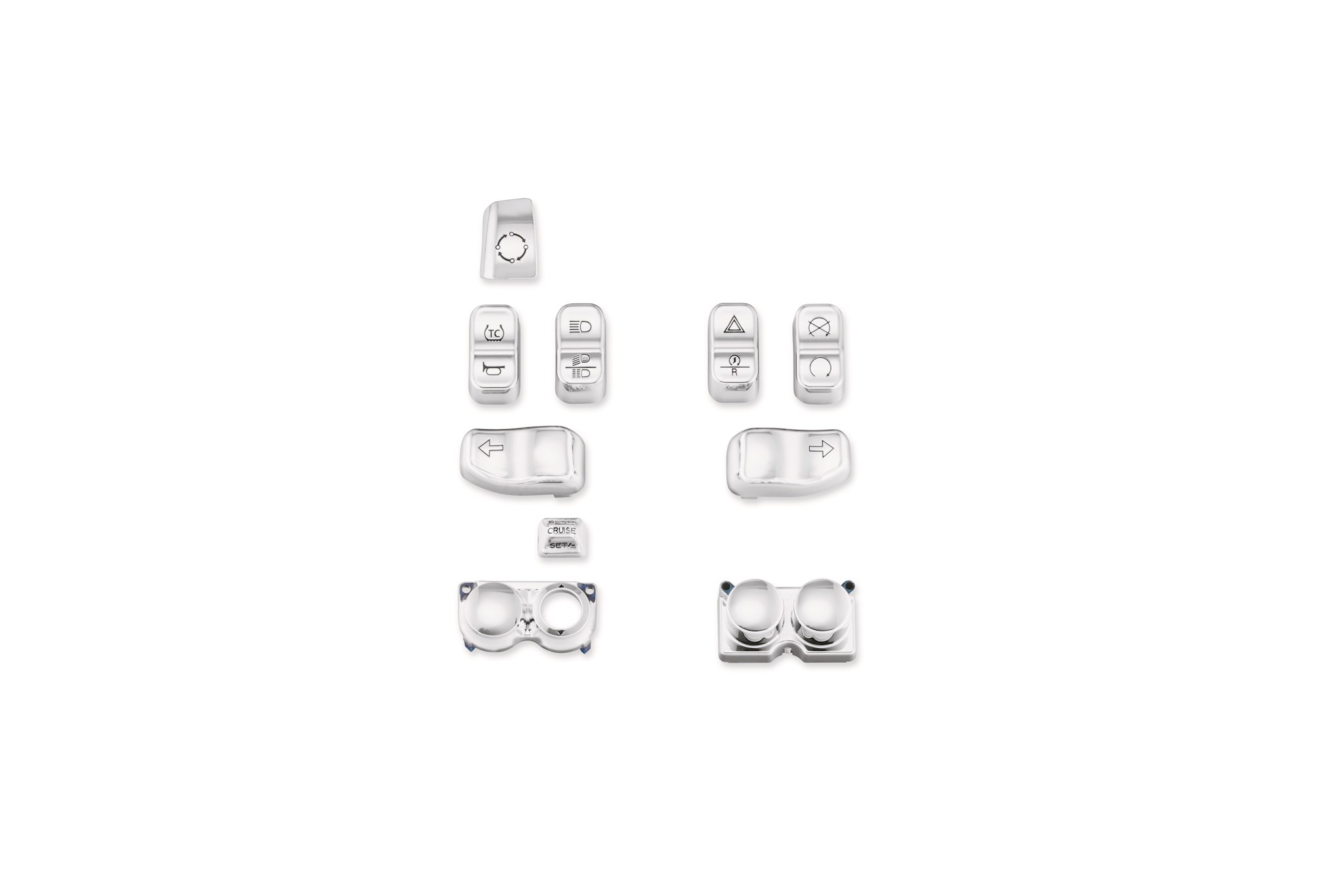 These Chrome Switch Cap Kits will add style to one of the most visible areas of your bike, the switches. Shaped for the same ergonomic feel as the Original Equipment hand control switches, these caps replace the stock black caps without re-wiring. The chrome switch caps complement other chrome hand control accessories (Chrome Master Cylinder Kit, Chrome Hand Levers, Chrome Switch Housings and Chrome Master Cylinder Cover) to complete the custom look.