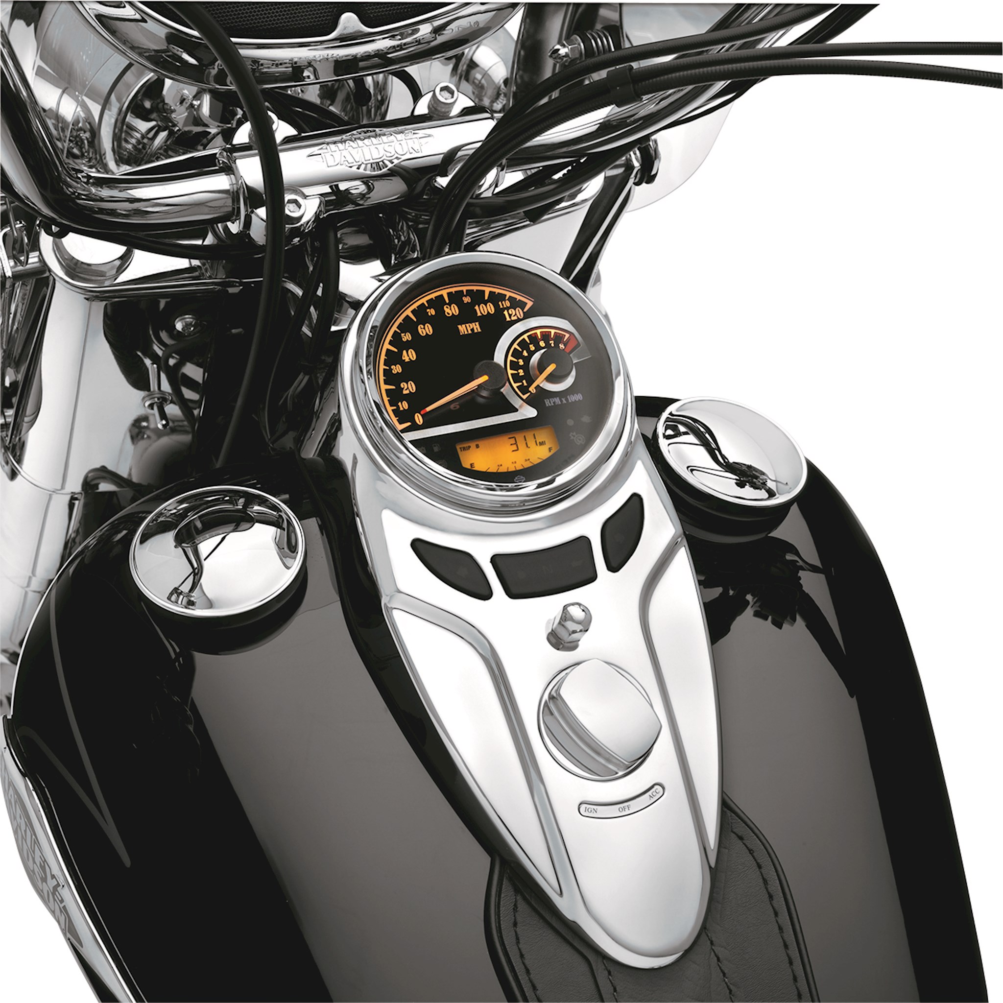 Gauges feature speedometer and tachometer pointers that sweep clockwise to provide a "gauge within a gauge" look. Kit includes a data transfer cable to easily upload initial mileage at time of installation. Fits '12-later Dyna, '11-later Softail and '14-later FLHR and FLHRC models with a 5.0" Speedometer (except FLSTSE2/3).