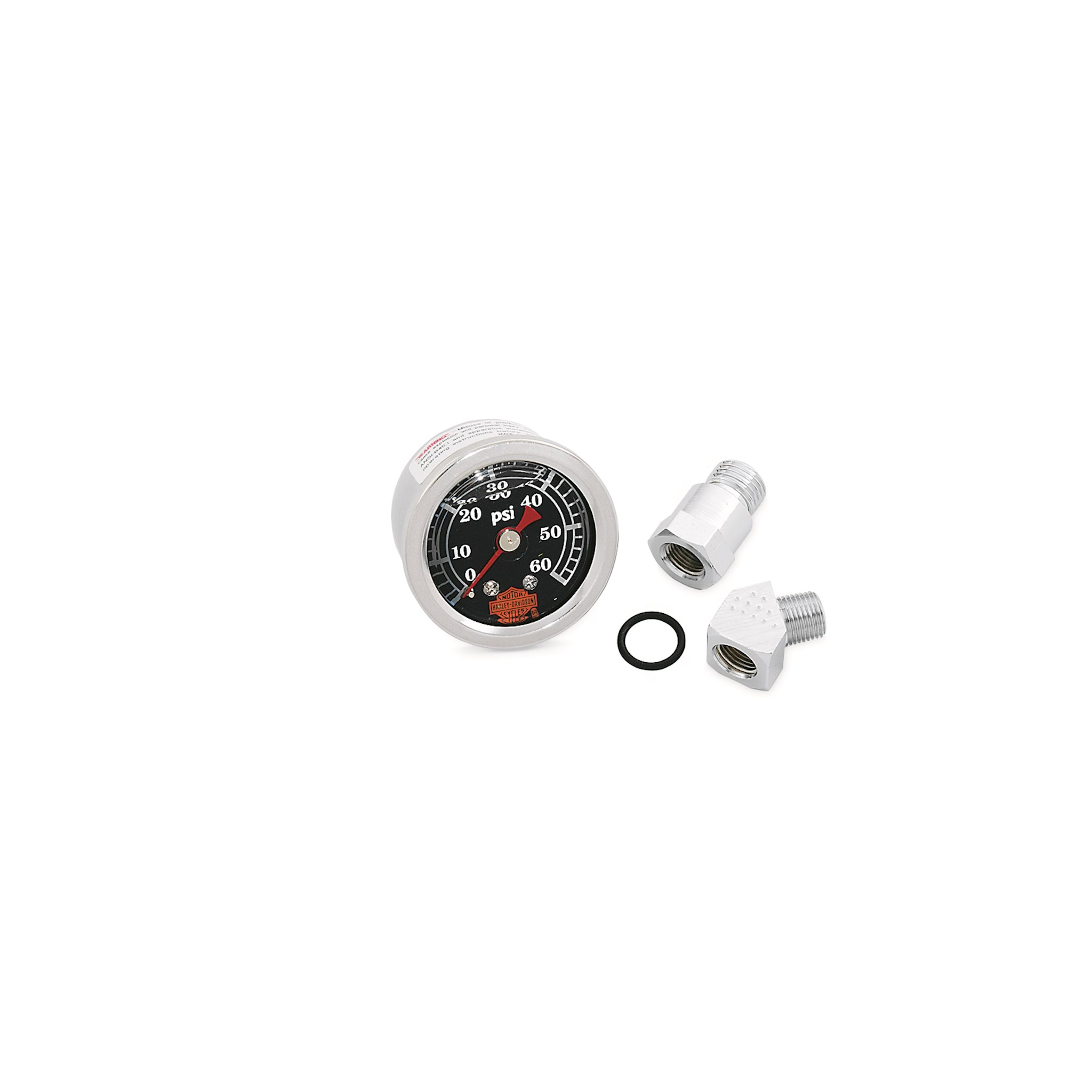 Contains special non-yellowing fluid that dampens the internal movement for improved gauge reliability. Incorporates corrosion-resistant stainless steel bezel and includes Harley-Davidson Bar & Shield graphics that match various late model instruments. Complete with chrome-plated steel fittings and O-rings for crankcase installation. New mounting design prevents damage from improper installation.