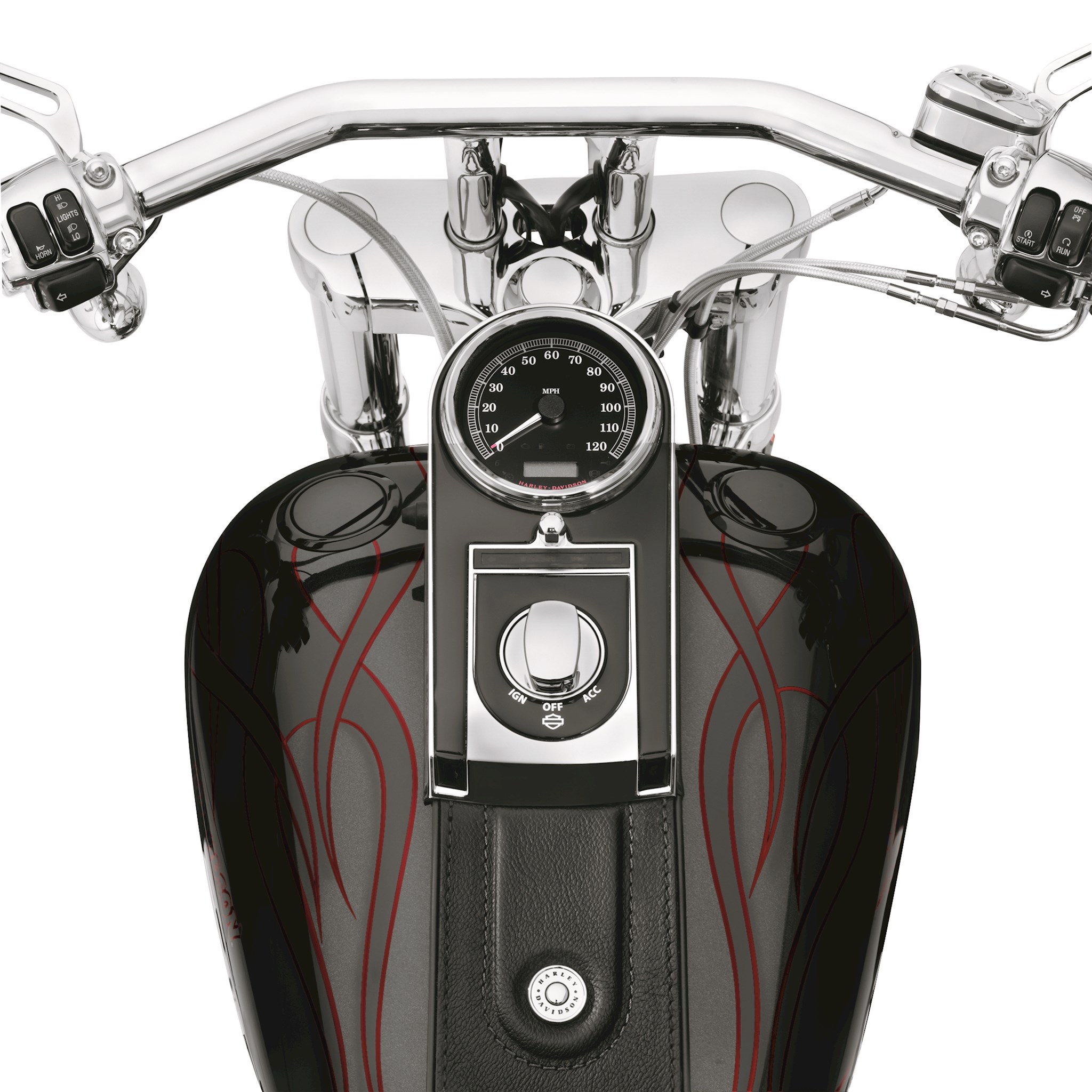 Emphasize the long and lean look of the fuel tank. This Flush-Mount Fuel Cap and Gauge Kit offers a pop-up filler design that when installed and sealed looks identical to the flush gauge. A simple push and the fuel filler cap pops up to provide ample grip, even while wearing gloves. The flush fuel gauge features individual LED lamps that shine through a mirror-coated glass that glows when the ignition is switched on. A photocell automatically adjusts LED brightness for improved visibility in direct sunlight and dims at night to avoid distraction. Complete kit includes fuel cap, fuel gauge, trim ring and plug-in wiring harness. Fits '04-'06 carbureted and '01-'07 fuel injected Softail models (except FXSTD/I).
