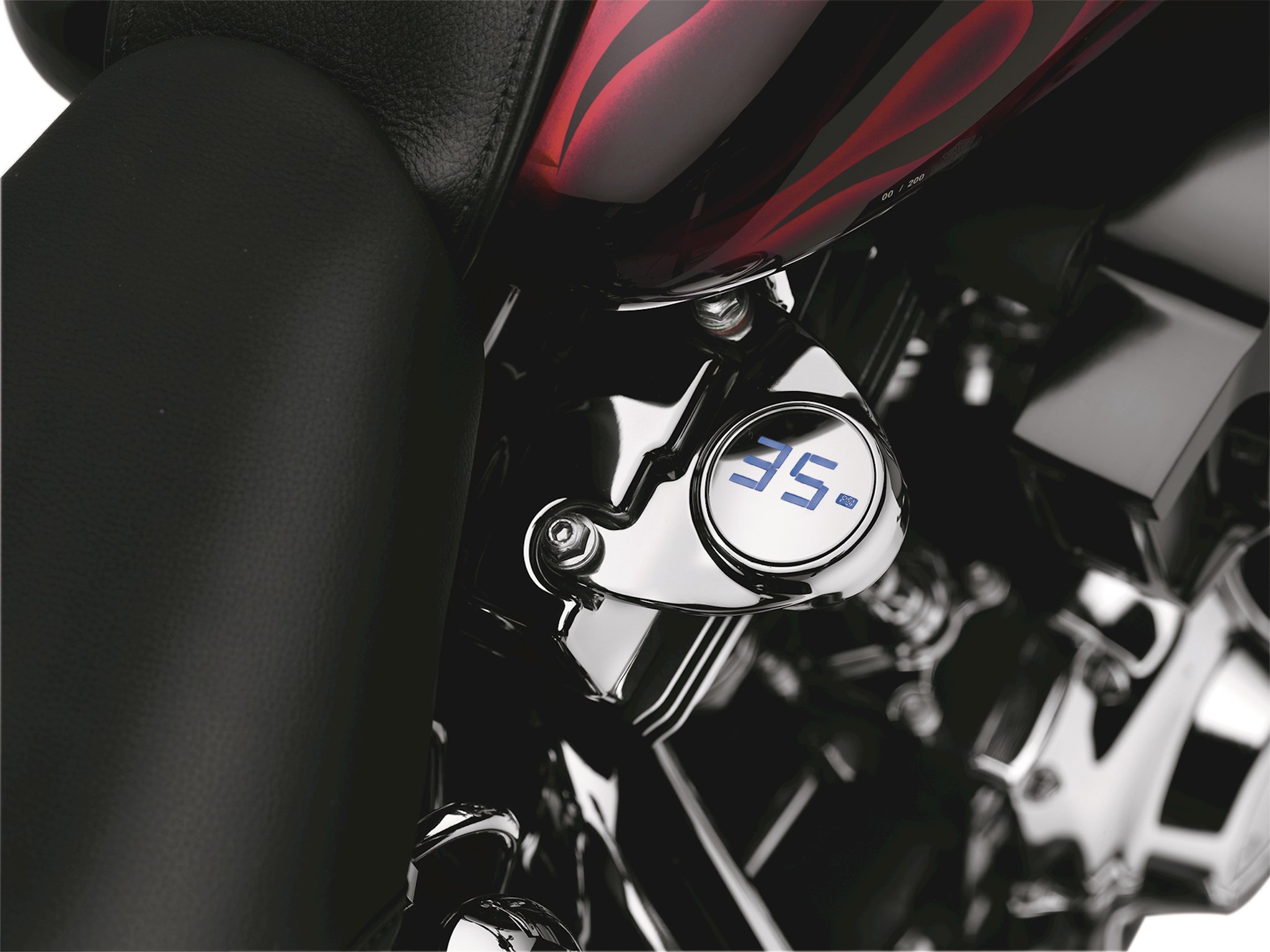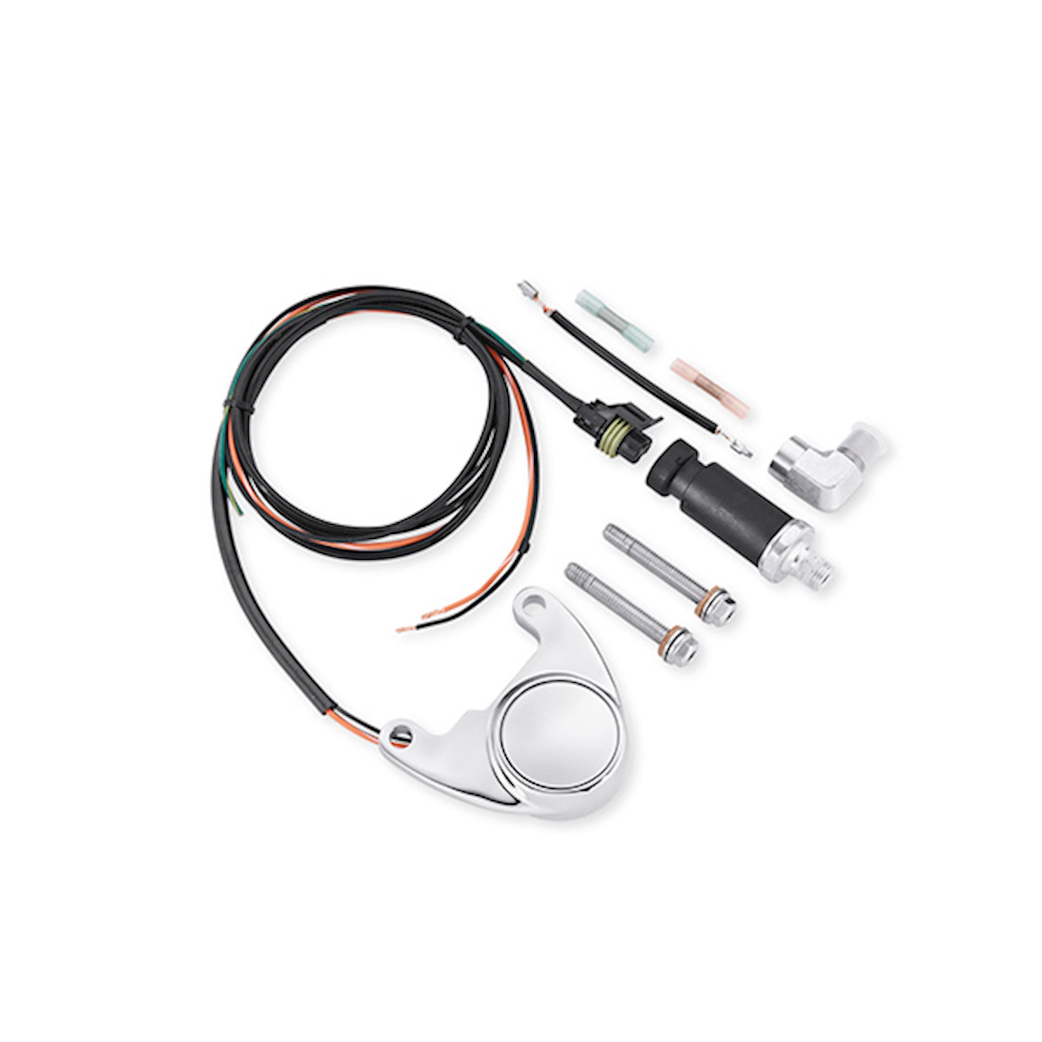 Keep an eye on your engine's vital signs. This Oil Pressure Gauge features a brilliant blue, easy-to-read digital display that shines through a mirror-coated glass when the ignition is turned on. The readout is invisible when not in use. A photocell automatically adjusts the display's brightness to improve visibility in direct sunlight or to dim the display at night to avoid distraction. The display can be toggled between PSI and BAR pressure readings. Kit includes die-cast mounting bracket with gauge, pressure sensor and wiring harness. Fits '99-later Dyna®, '00-later Softail®, '99-later Road King®, Electra Glide® Standard and Freewheelerâ„¢ models. Also fits '99-later Electra Glide Classic, Ultra Classic®, Limited and Tri Glide models if original oil pressure gauge is disconnected. Does not fit with Billet Rocker Box Covers P/N 17658-03, Burst Rocker Box Covers P/N 25700251, Mid-Frame Air Deflectors P/N 58022-07A or 58170-09. '12-later Dyna and '11-later Softail models require separate purchase of Electrical Connection Kit P/N 72673-11.