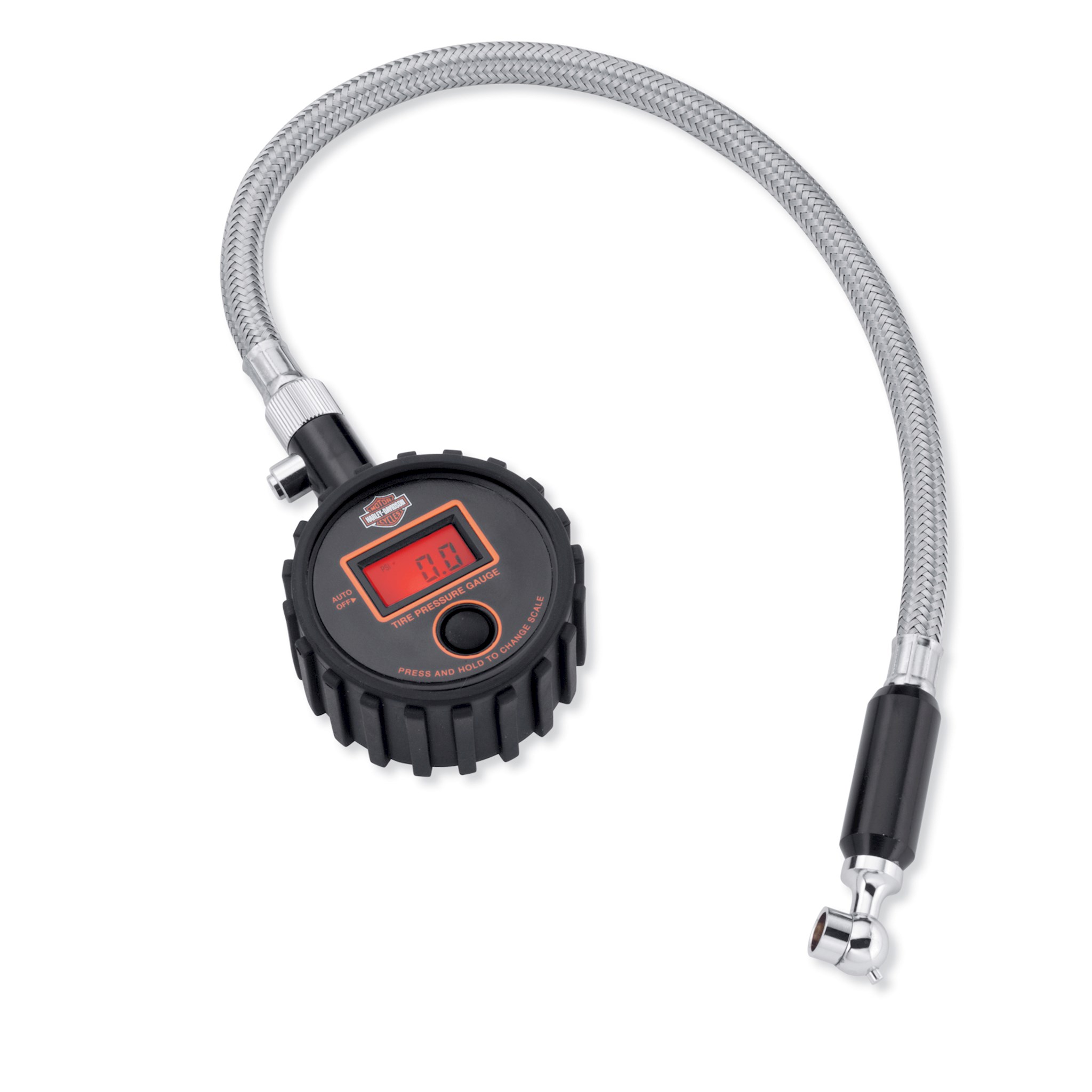 Back-lit Digital Tire Pressure Gauge is easy to read at any time of day. Providing accurate pressure readings in 0.50 psi increments up to 60 psi. Scale can be changed to read psi, bar, Kg or kPa pressure with the touch of a button. This versatile gauge features a 12" braided line and 90 degree angle chuck for easy access to valve stems, and a tough rubber jacket to protect the gauge from damage. Batteries are included.