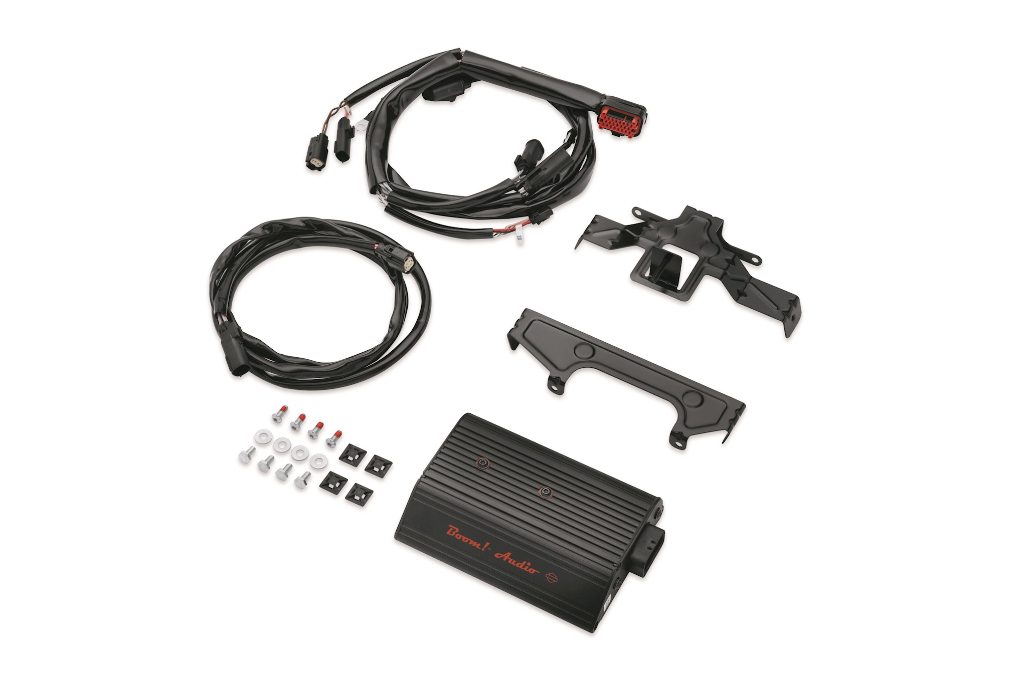 Take your music to the streets. Boom! Audio Amplifier Kits allow you to crank up the volume with significantly less distortion. The amplifier provides more power than Original Equipment radio alone, resulting in increased volume, fuller sound reproduction, reduced clipping and lower Total Harmonic Distortion (THD) than head unit alone. Unlike aftermarket amplifiers that connect between the radio and the speakers, the Boom! Audio amplifier bypasses the radio's internal power amp to produce the cleanest sound possible. The Boom! Audio Amplifier boosts the pure source signal, minimizing any distortion generated through the speaker output. The system-matched high-output signal features optimized sound equalization for crisp, clear vocals and maximum bass response and the strong midrange response cuts through wind and road noise. The waterproof 4-channel, 75-watts/channel amplifier (300-watt total) has been designed from the ground-up for the harsh motorcycle environment. Kit includes all mounting hardware and wiring harness. Note: The use of the Boom! Audio Amplifier turns off the radio's internal amplifier. Installation of a third or fourth set of speakers requires the Boom! Audio Speaker Expansion Kit.
