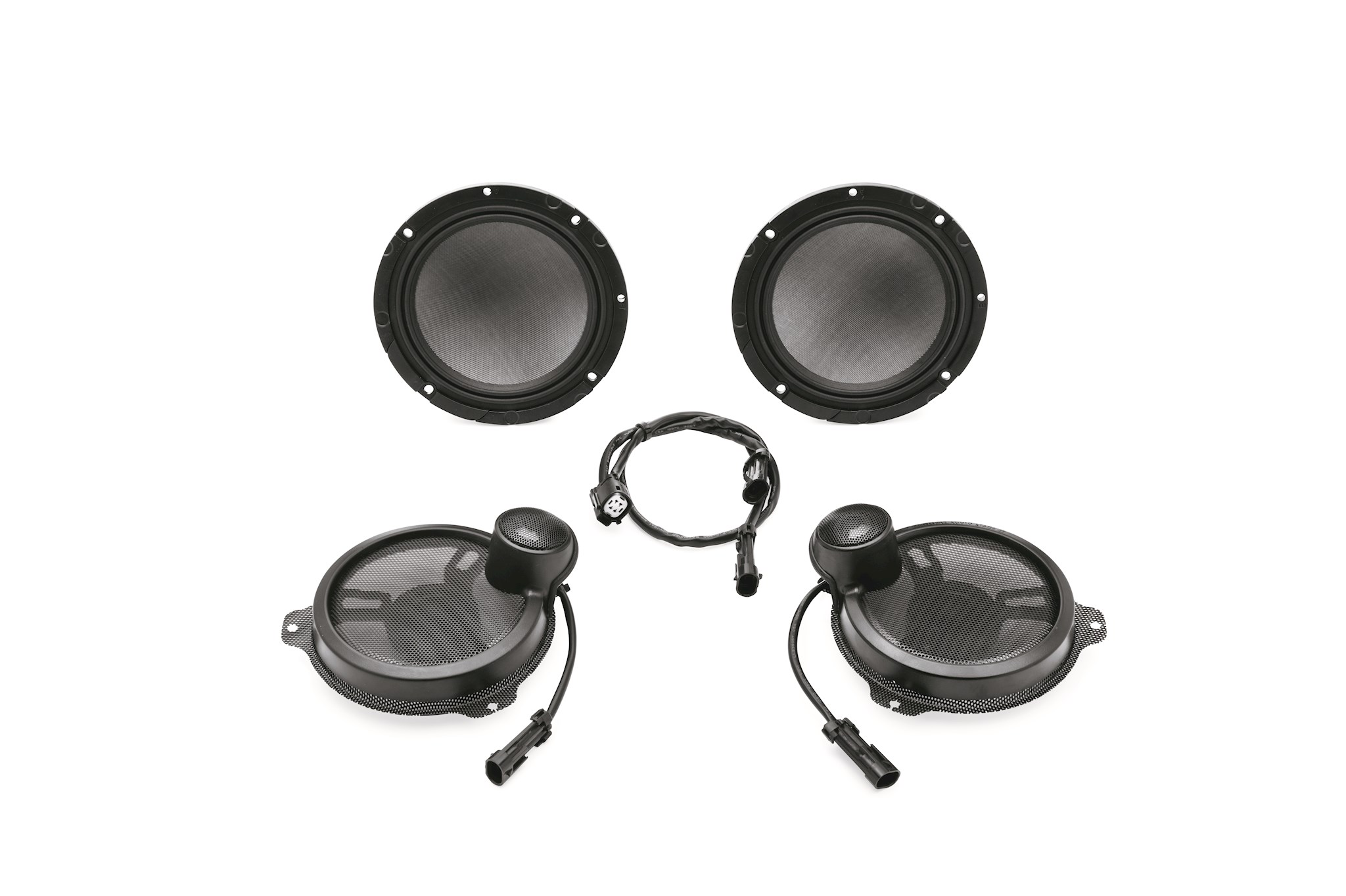 Stage II Fairing Speakers feature a 6.5" long-throw woofer for low frequencies, a bridge mounted mid-frequency driver, and a separate tweeter for high-frequencies. Like true audiophile components, each speaker is powered by two channels from our 300 watt amplifier - one channel powers the woofer, and another powers the mid/tweeter combo. When powered by separate dedicated bass and high-frequency amplifier channels, you are doubling the power to each speaker when compared to our Boom! Audio Stage I system. The results? You get thumping bass response, sizzling vocals and clean, distortion free performance at all volume levels. Built with composite speaker frames, powerful magnets and protective perforated metal grills, these weather and vibration resistant speakers are designed for life on the road. Complete kit includes 2 three-way speakers, grills and plug-in connections. Separate purchase of fairing mount amplifier is required.
