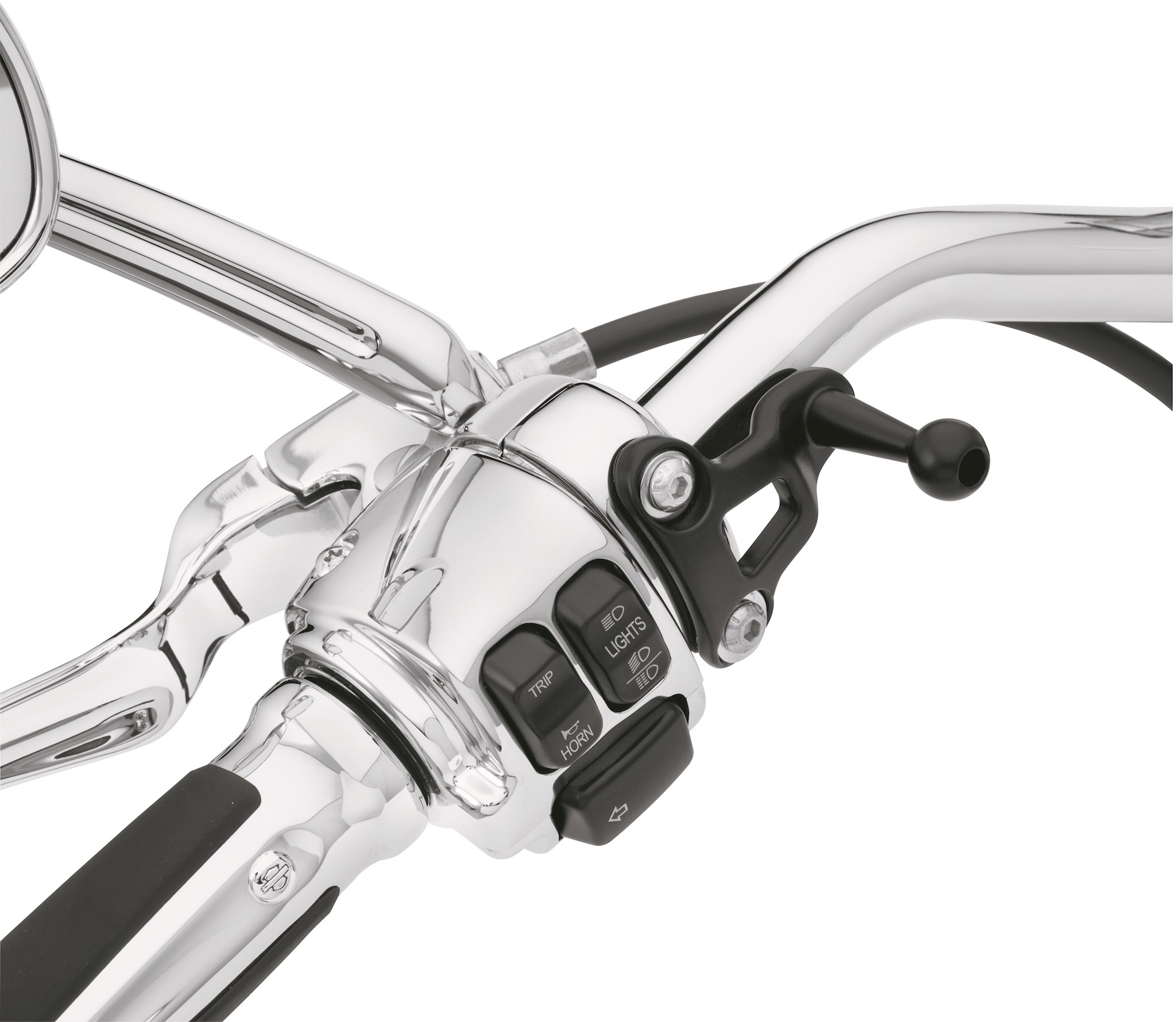 Designed to place a smartphone or music device close at hand, this ball-tipped mount is secured to the left-side or right-side hand control perch for easy access. When combined with the Universal Phone Carrier P/N 76000549 or Water Resistant Carriers P/N 76000576, 76000605 or 76000670, the ball-shaped mount provides a wide range of adjustability for the ideal viewing angle.