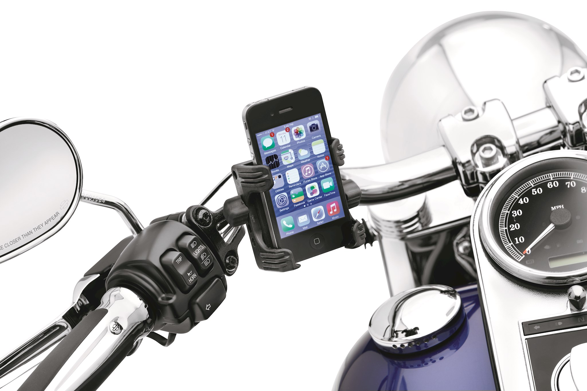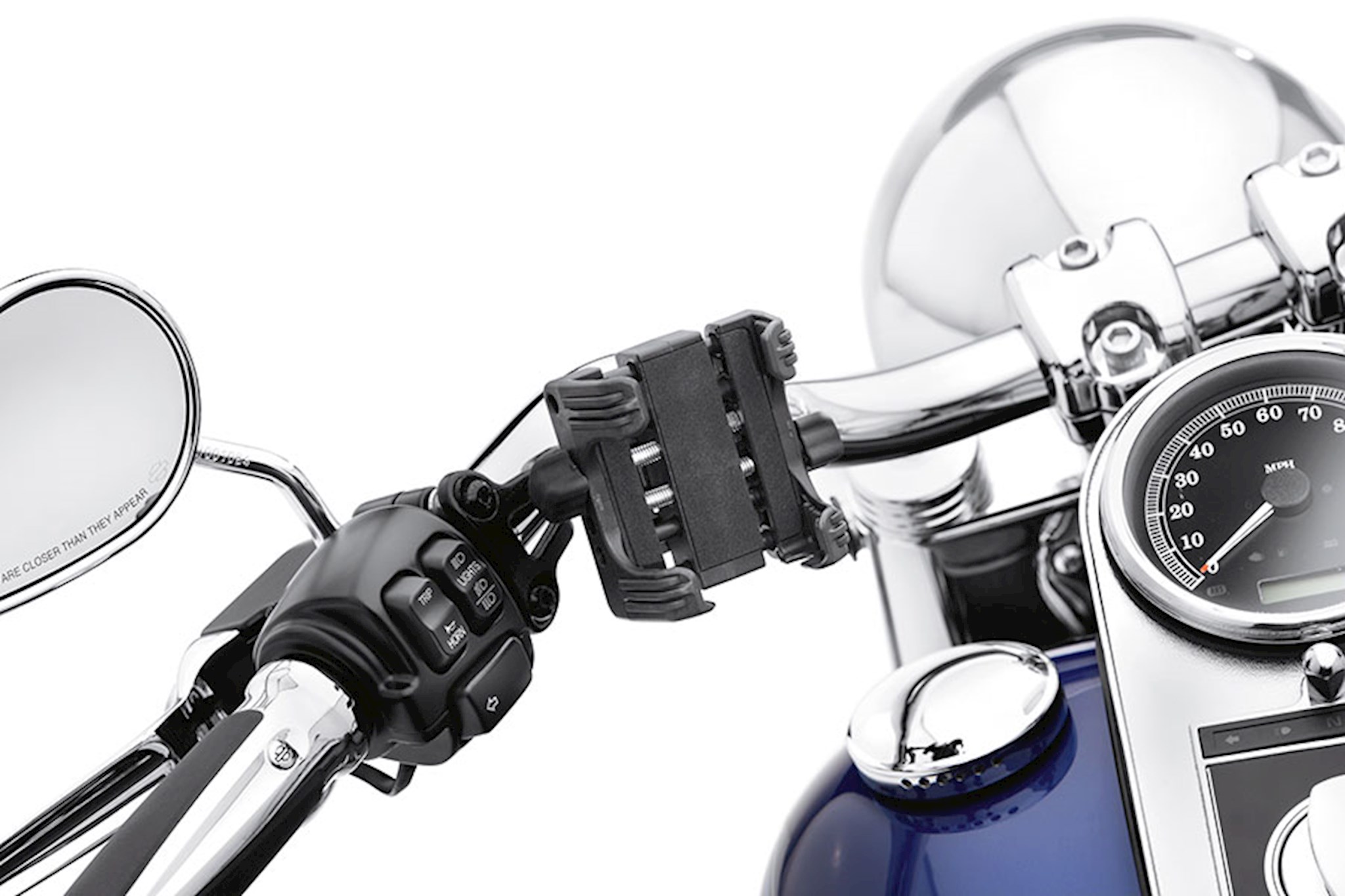 Put your smartphone within easy reach. This standard cradle places your phone or music device close to the hand controls of the motorcycle for easy access. Dual thumb screw clamps quickly adjust to grip the phone, and non-slip pads hold the device in place - in vertical or horizontal orientation. When combined with the control lever perch Phone Carrier Mount (sold separately), the swivel head allows the phone to be rotated into the ideal viewing position, and the device can be removed in seconds when you reach your destination. Holds devices measuring 1.75" to 3.5" wide.