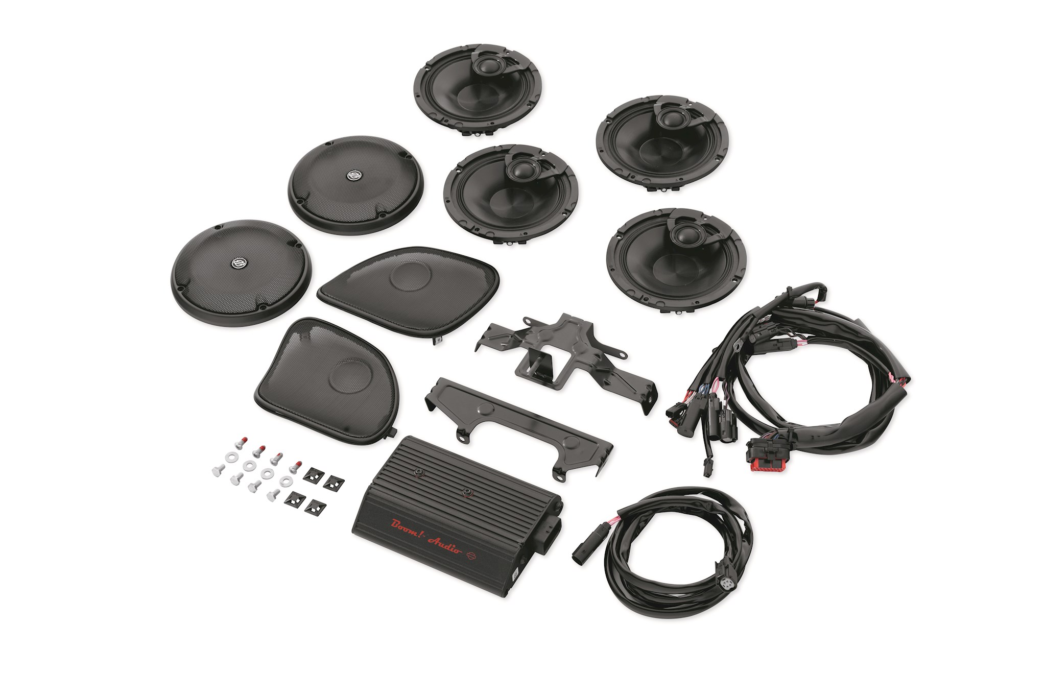 Kit includes Boom! Audio 6.5" fairing and rear speakers, Boom! Audio 4-channel fairing-mounted amplifier, amplifier mount and wiring harness.