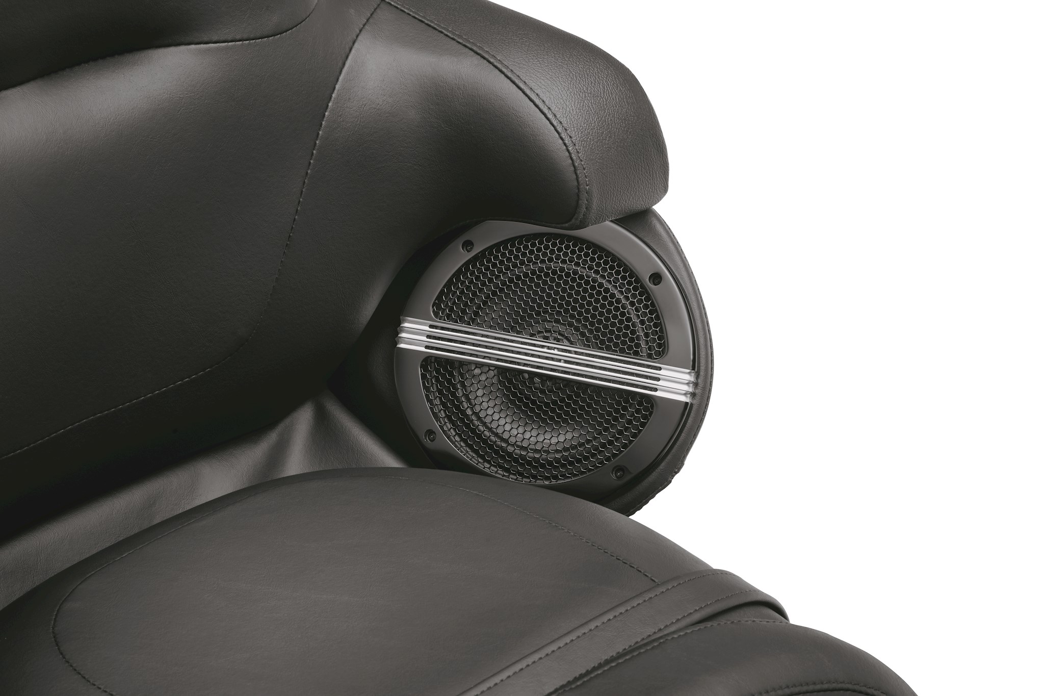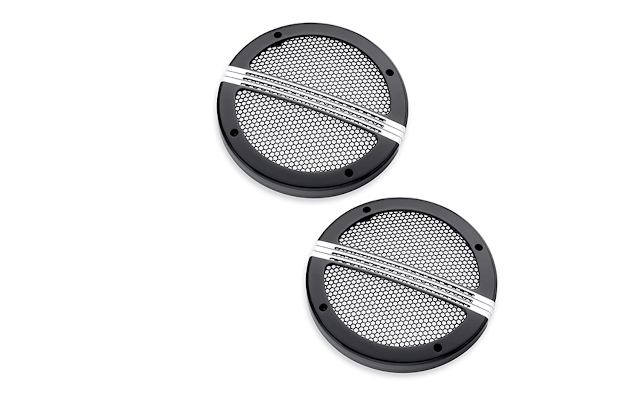 Singing a different tune. Defiance Speaker Grills wrap the Original Equipment or Boom!™ Audio Stage I speakers for a harmonious look. Featuring rich honeycomb mesh and slim horizontal rails, the Defiance Speaker Grills protect the speaker cone while adding a luxurious touch to your bike's sound system. Available in your choice of mirror chrome, gloss black or cut back black finishes to match your customizing style. Sold in pairs. Fits '14-later Electra Glide, Road Glide, Street Glide and Tri-Glide models with Tour-Pak™ mounted speakers with Original Equipment or Stage I Speakers. Does not fit with Spectra Glo Speaker Illumination Kits.
