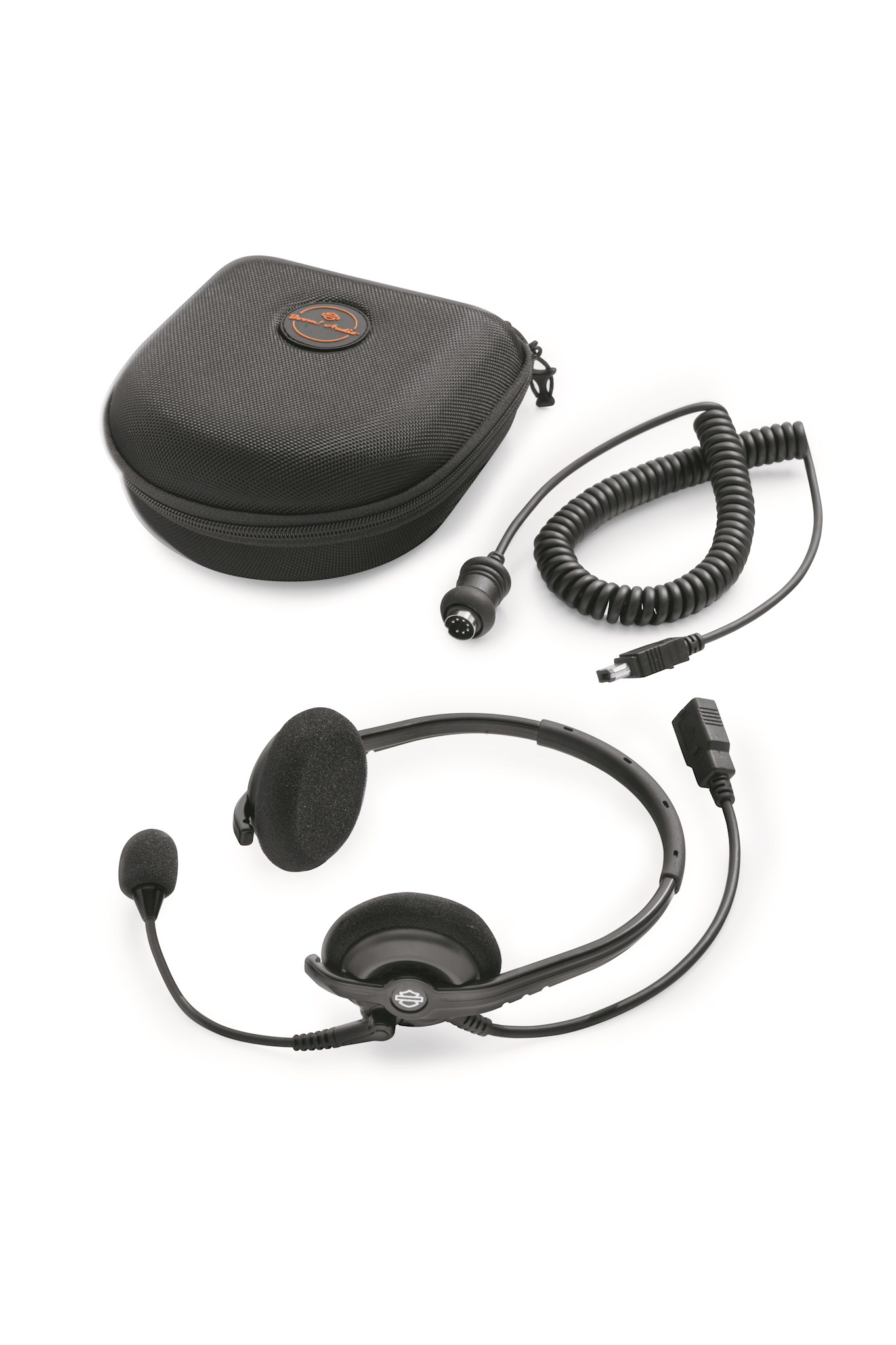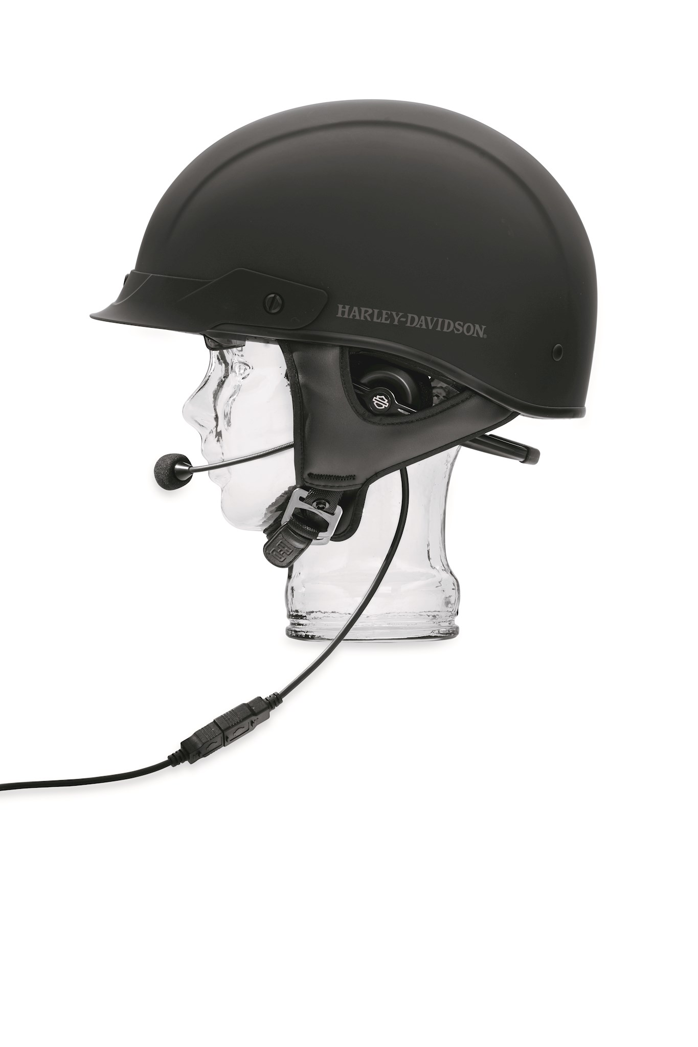 This comfortable headset is designed to allow full music and communication function while wearing a half helmet. High-strength pivoting neck band with rubber protector wraps across the back of the neck and fits comfortably below the shell of most half helmets. Over-the-ear hooks keep speakers comfortably in place. This headset features premium voice coils and vented housings for enhanced bass, mid and high frequency response. The great-sounding foam-covered on-ear stereo headphone cups reduce wind noise while allowing you to hear surrounding traffic. The adjustable boom microphone with wind sock has been optimized for use with Harley-Davidson® intercom and Bike-to-Bike communications equipment and the streamlined cord with push button clothing clip and quick-disconnect plug allows you to step away from the motorcycle without removing the headset. The 7-pin DIN plug can be connected to the front and rear communications ports, allowing both rider and passenger access to the music, navigation and voice communications features of the motorcycle. The headset includes a custom zippered storage case for added protection.