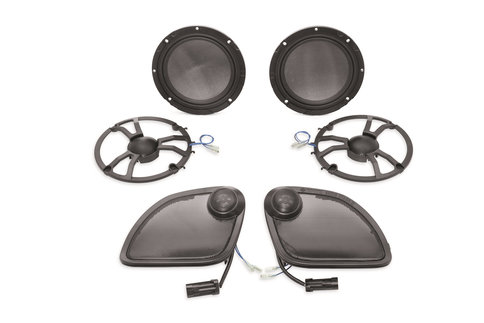 Stage II Fairing Speakers feature a 6.5" long-throw woofer for low frequencies, a bridge mounted mid-frequency driver, and a separate tweeter for high-frequencies. Like true audiophile components, each speaker is powered by two channels from our 300 watt amplifier - one channel powers the woofer, and another powers the mid/tweeter combo. When powered by separate dedicated bass and high-frequency amplifier channels, you are doubling the power to each speaker when compared to our Boom! Audio Stage I system. The results? You get thumping bass response, sizzling vocals and clean, distortion free performance at all volume levels. Built with composite speaker frames, powerful magnets and protective perforated metal grills, these weather and vibration resistant speakers are designed for life on the road. Complete kit includes 2 three-way speakers, grills and plug-in connections. Separate purchase of fairing mount amplifier is required.