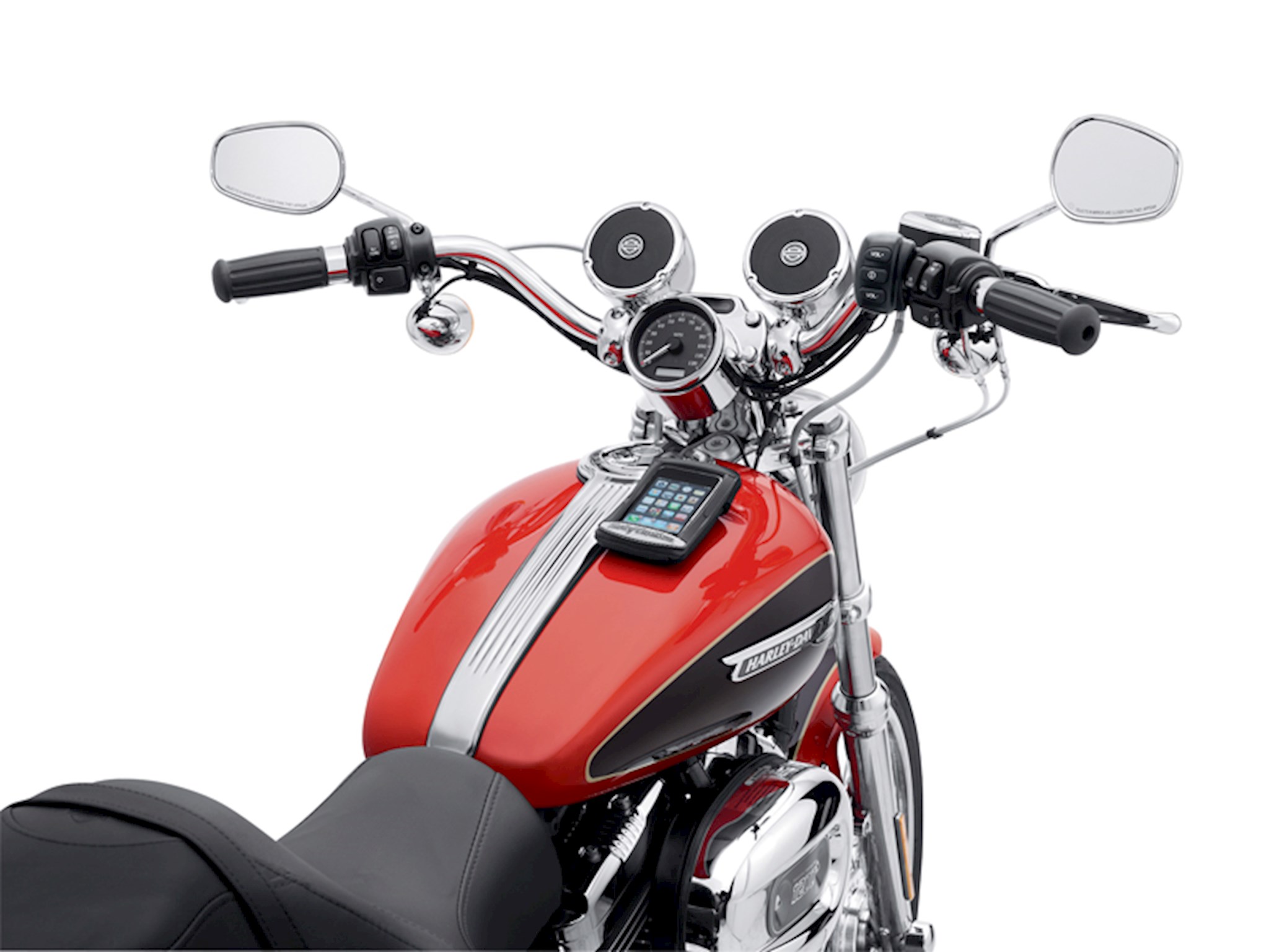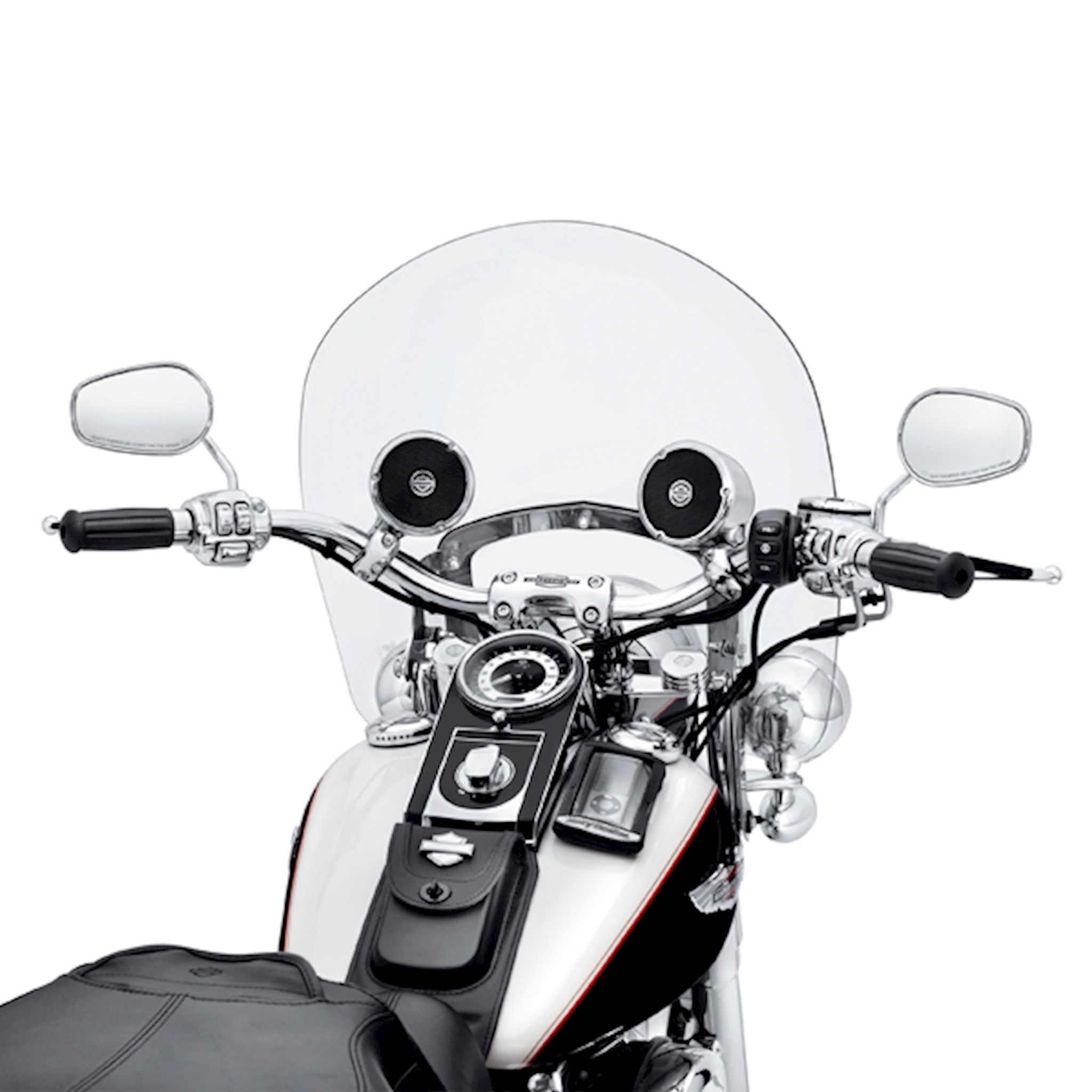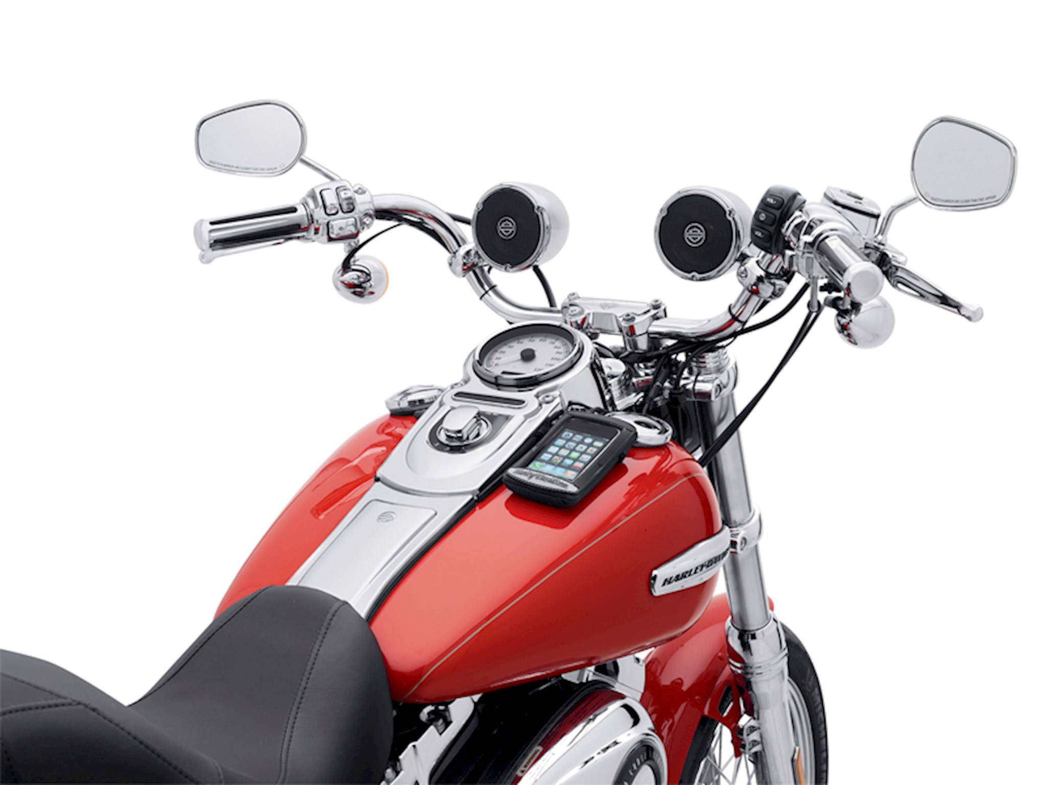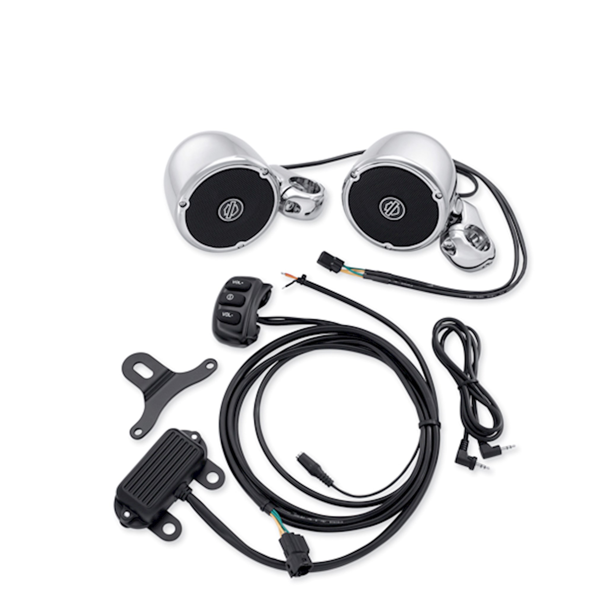 Add tunes to your ride. These Boom!™ Audio Cruiser Amp and Speaker Kits provide amplified music through two great-sounding 3.5" speakers. Available in chrome or black finish, the individual speaker pods clamp to either a 1" or 1-1/4" handlebar and can be adjusted to direct the sound toward the rider. The waterproof speaker elements are protected behind stylish black and chrome grills that are finished with a center-mounted Bar & Shield medallion. The compact two-channel, 40-watt stereo amplifier mounts out of the way on the frame down tubes, and the 1/8" (3.5mm) stereo auxiliary input connects to most portable audio players, some of which can be easily housed in our convenient Boom! Audio Music Player Tank Pouch. The integrated hand control features volume up/down buttons and a backlit on/off button, and is designed for easy operation with your right thumb, even while wearing gloves. Complete kit includes all wiring and mounting hardware. Fits '04-later XL, '12-later FLD, '10-later FXDWG, '00-later Softail® (except FLS and FXS) and '99-later Road King® models. '12-later Dyna® and '11-later Softail models require separate purchase of Electrical Connection Kit P/N 72673-11. '14 FLHR and FLHRC models require Electrical Connection Kit P/N 69200722. All other years and models require separate purchase of Relay Service Kit P/N 69200397. Not for use with Road Tech™ zu¯mo® and stock handlebar on XL or FXSTB models. Not for use with Frame Mounted Highway Pegs P/N 50855-09 or 50865-09, Sport Windshields, 1/4 Fairing, or windshield bags.