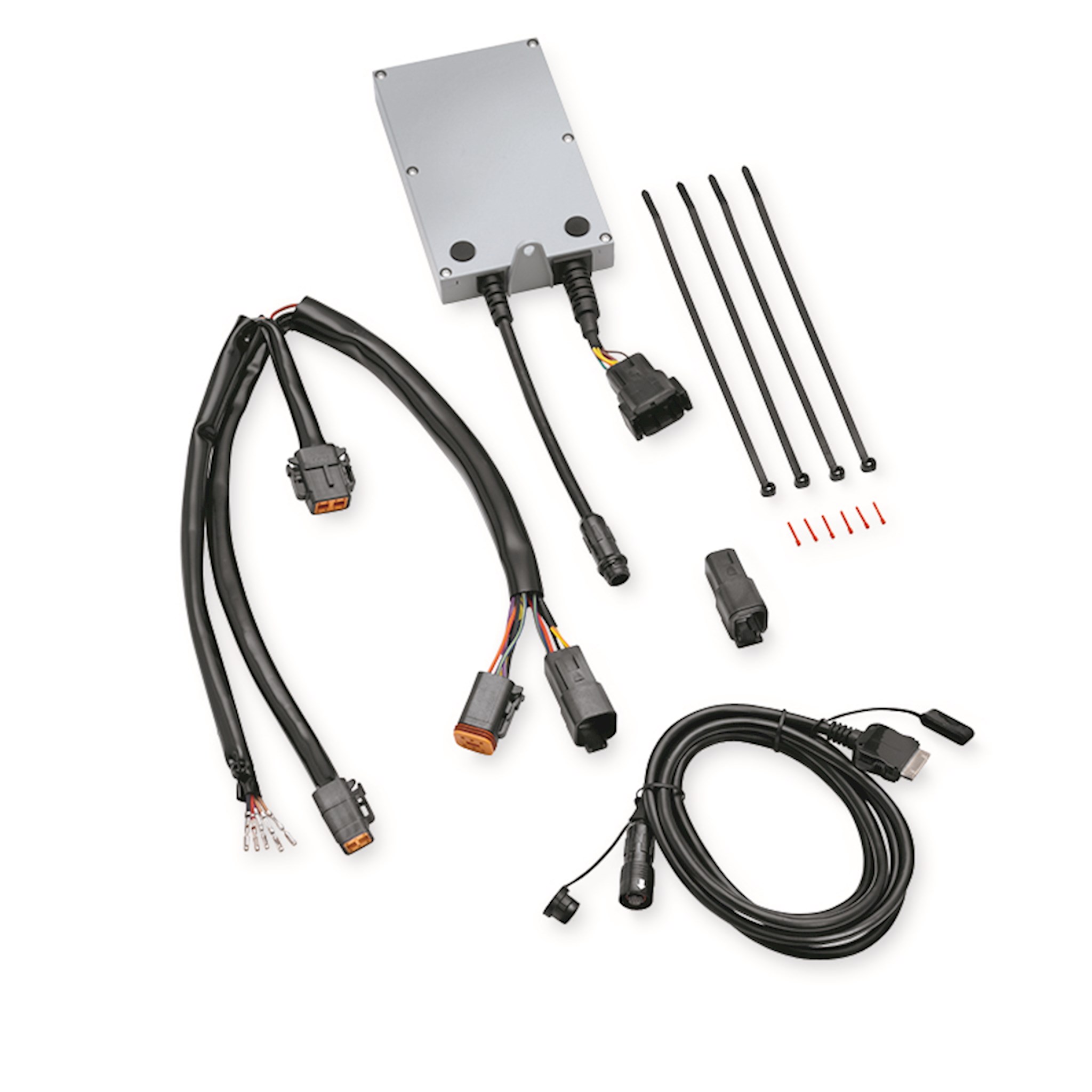 Available exclusively for models equipped with the Harley-Davidson® Advanced Audio System by Harman/Kardon®. The Boom!™ Audio iPod® interface allows you to access your iPod playlists, artists, songs and albums while you keep your hands on the handlebar. At the touch of your fingertips, you can use the factory audio hand controls to scan through the iPod menus and view the selections on the radio face. The module mounts directly to the radio and is concealed inside the fairing for a clean look. Just plug in your iPod nano®, iPod Touch® or iPhone® and hit the road. Kit includes a powered iPod cable that charges your player when it is connected to the system and the bike is turned on. The iPod can be remotely stored in the saddlebag with the separate purchase of Boom! Audio Saddlebag iPod Holder P/N 76000143.