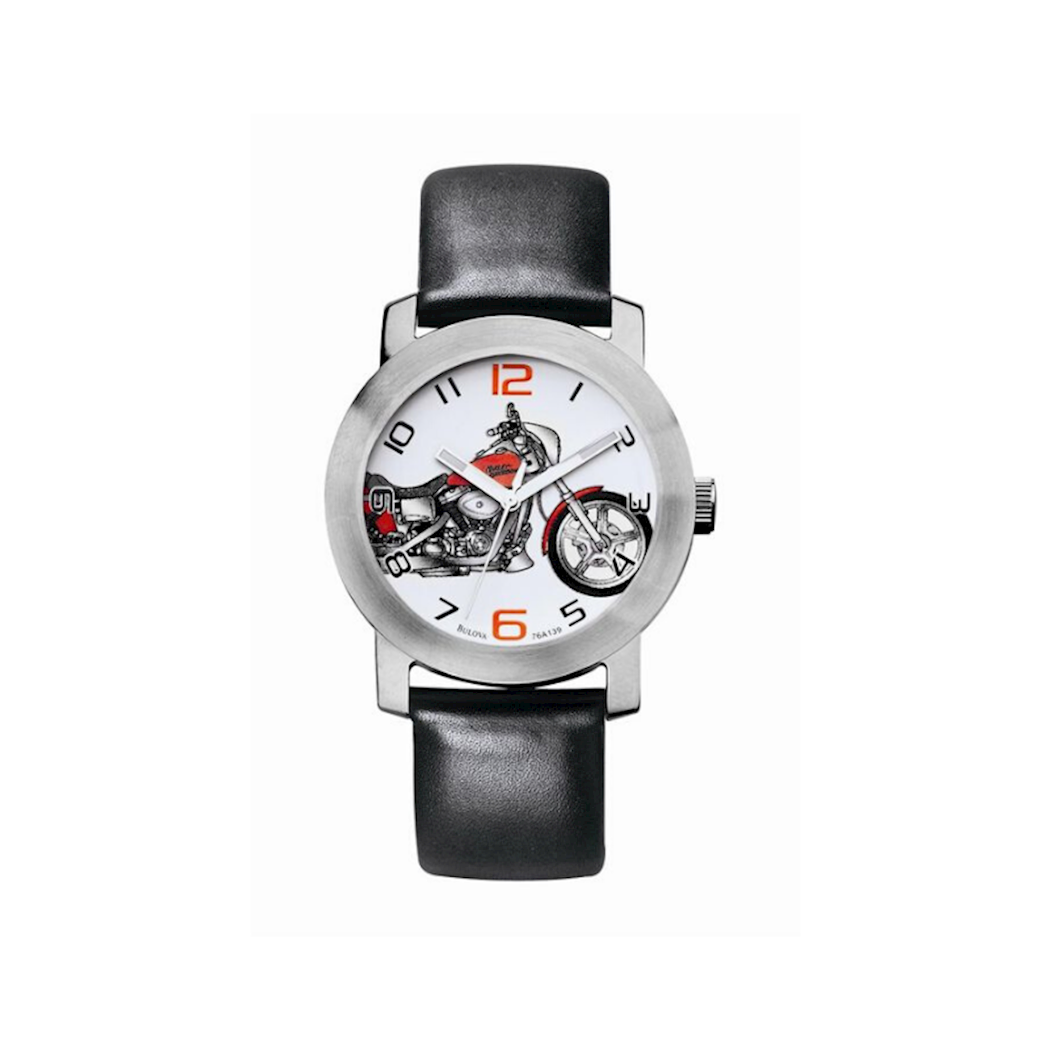 Motorcycle in display. 2 Year Warranty through Bulova. Stainless steel. Leather strap, black. 40 mm.