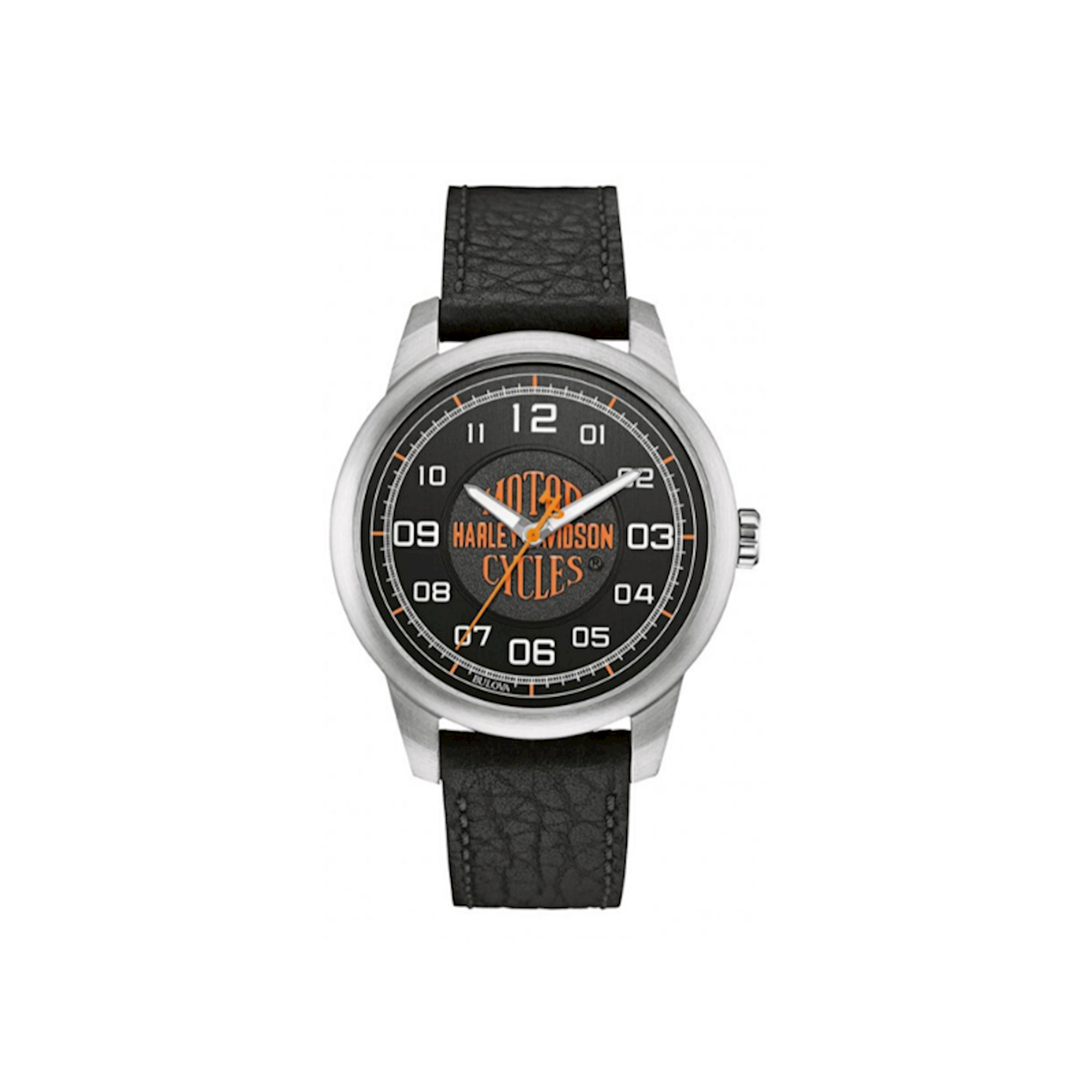 Black dial with center orange Harley-Davidson® logo. 2 Year Warranty through Bulova. Stainless steel case with black buffalo grain strap. Luminous filled hands. Orange second hand with signature H-D counterweight.