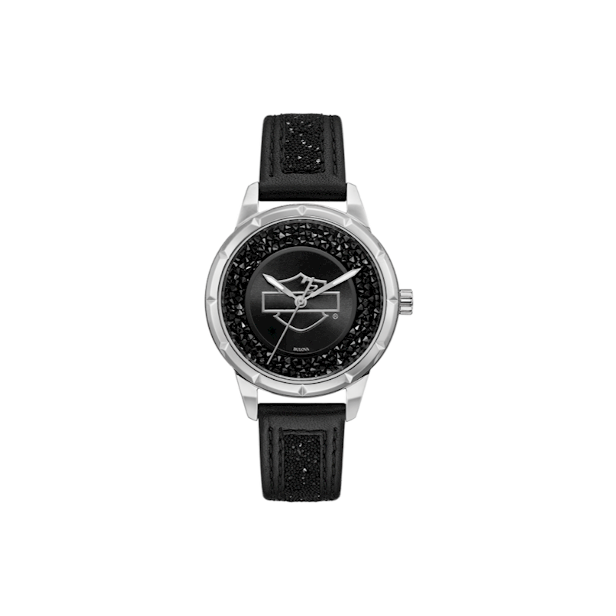 2 Year Warranty through Bulova. Black dial embellished with Swarovski crystals on the outer zone. Stainless steel case with textured markers lining the bezel. Crystal continues to rock on the leather strap with black Swarovski crystal embellishments. Three-piece buckle closure.