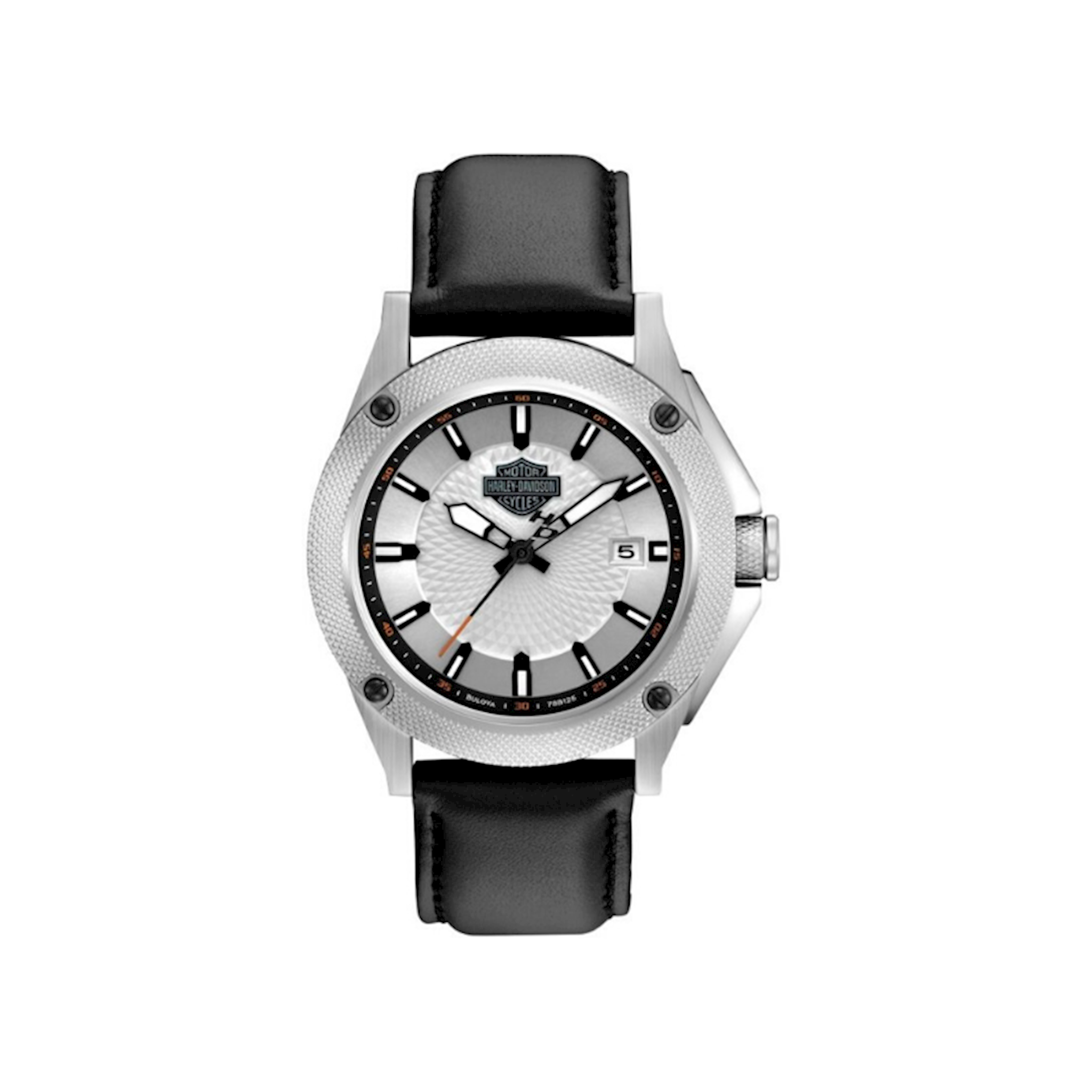 Silver patterned dial with luminous hands and markers. 2 Year Warranty through Bulova. Stainless Steel case with leather strap. Knurled "top grip" bezel with screw-head detailing. Features calendar.