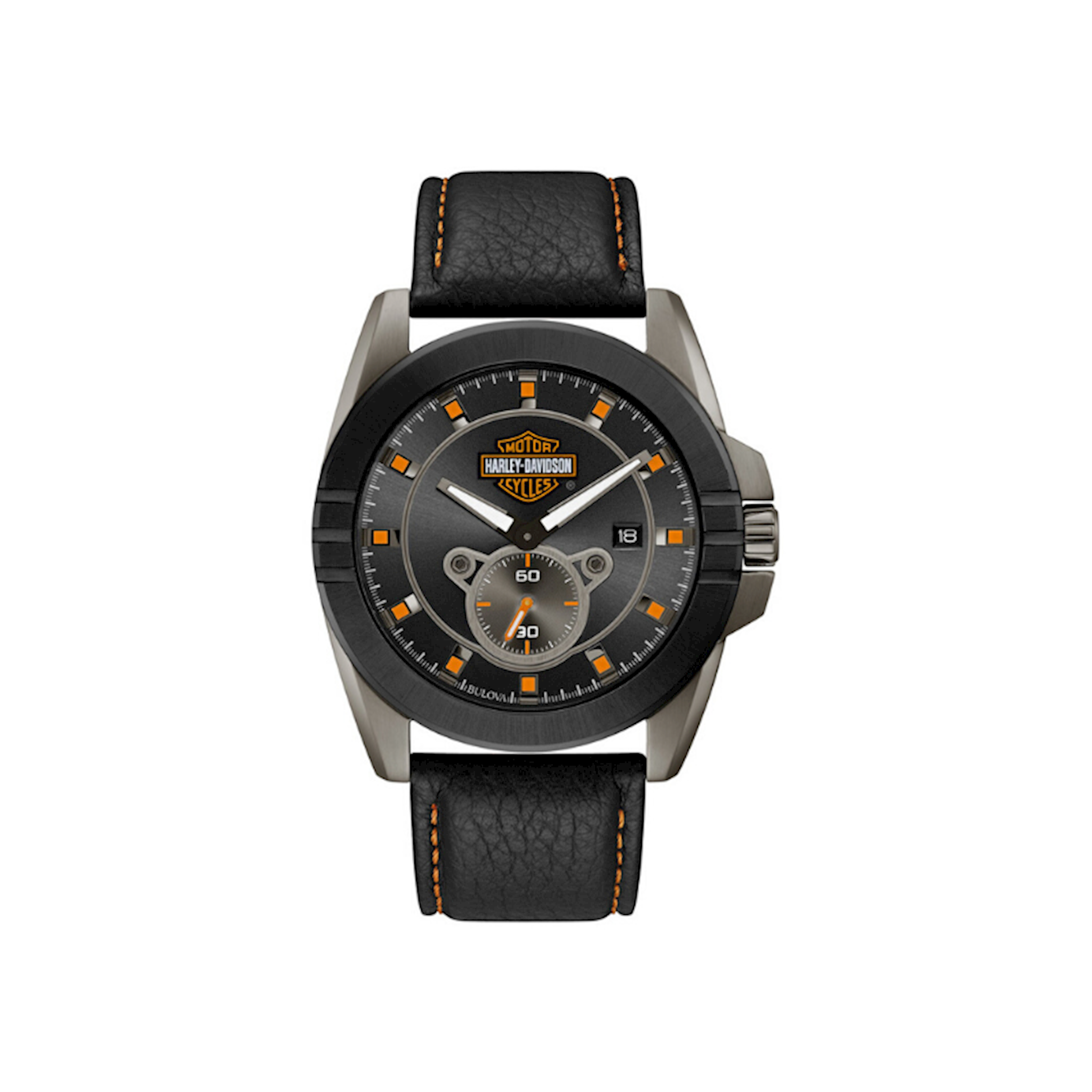 Black dial with designed seconds sub-dial inspired by the throttle mounting hardware. 2 Year Warranty through Bulova. Calender feature. Gray-tone stainless steel case with black ion-plated accents. Black leather strap with orange contrast stitching and lining.