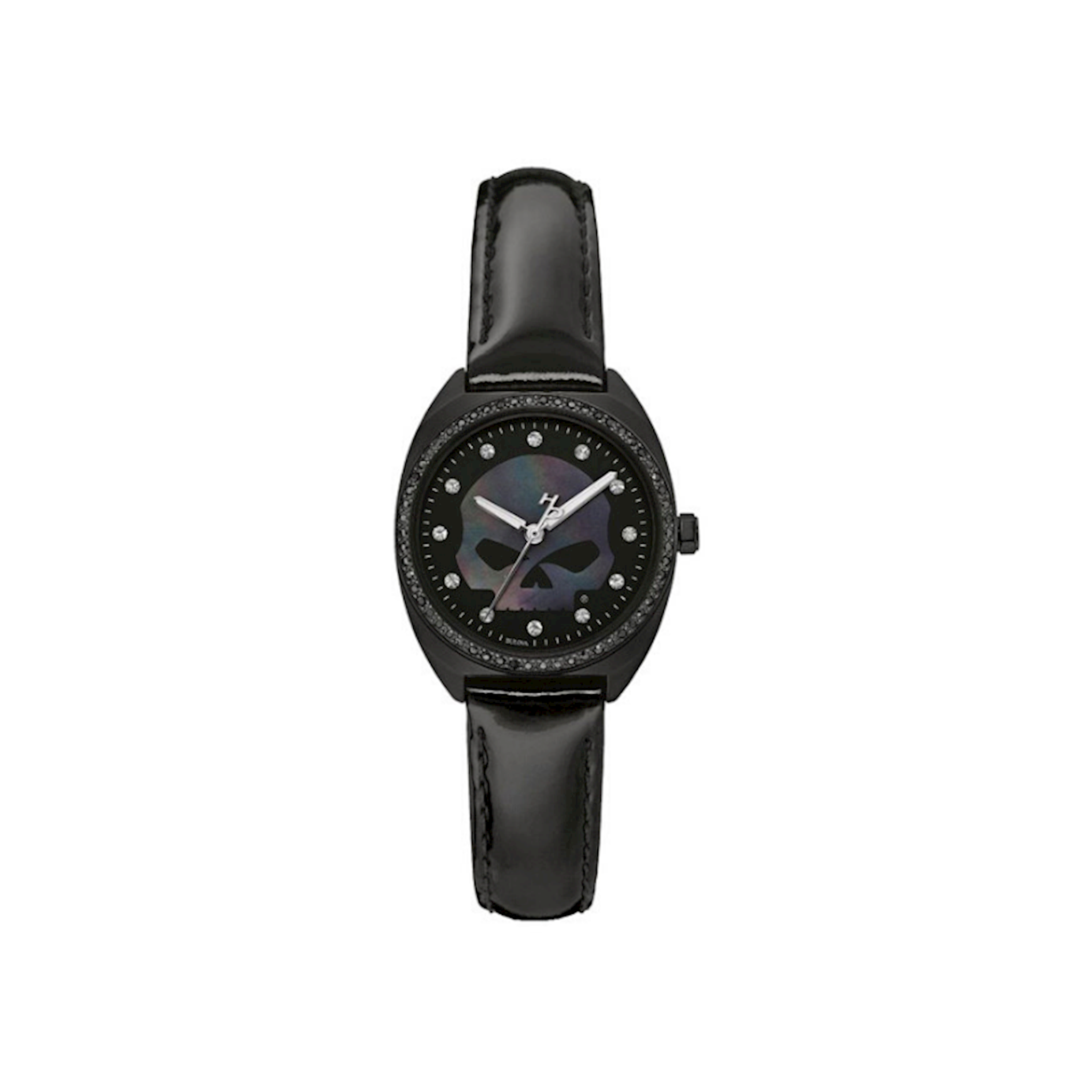 Features 70 beautiful hand-set crystals on bezel and hour markers. 2 Year Warranty through Bulova. Stainless steel case in black ion-plated finish and black patent strap. Multi-layer black dial with mother-of-pearl Willie G Skull detail. White luminous filled hands and white second hand with signature H-D counterweight. Construction: 50m/165 ft (5 ATM).