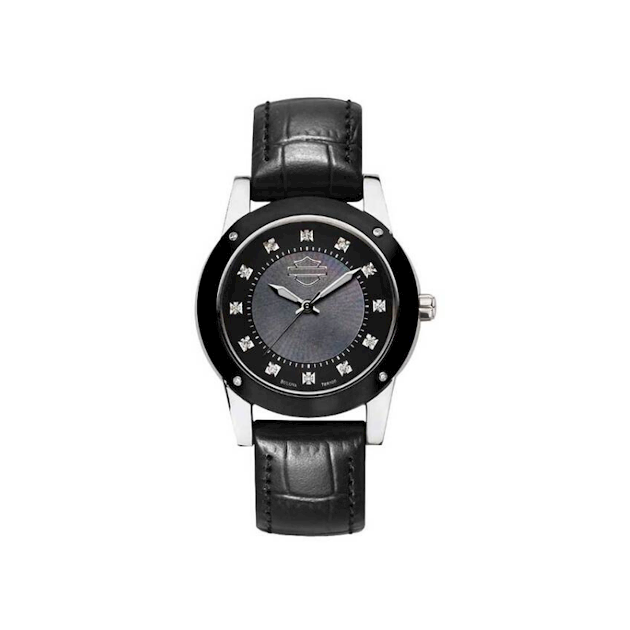 Harley-Davidson® Women's Watch, Mother-Of-Pearl, Black Leather Strap