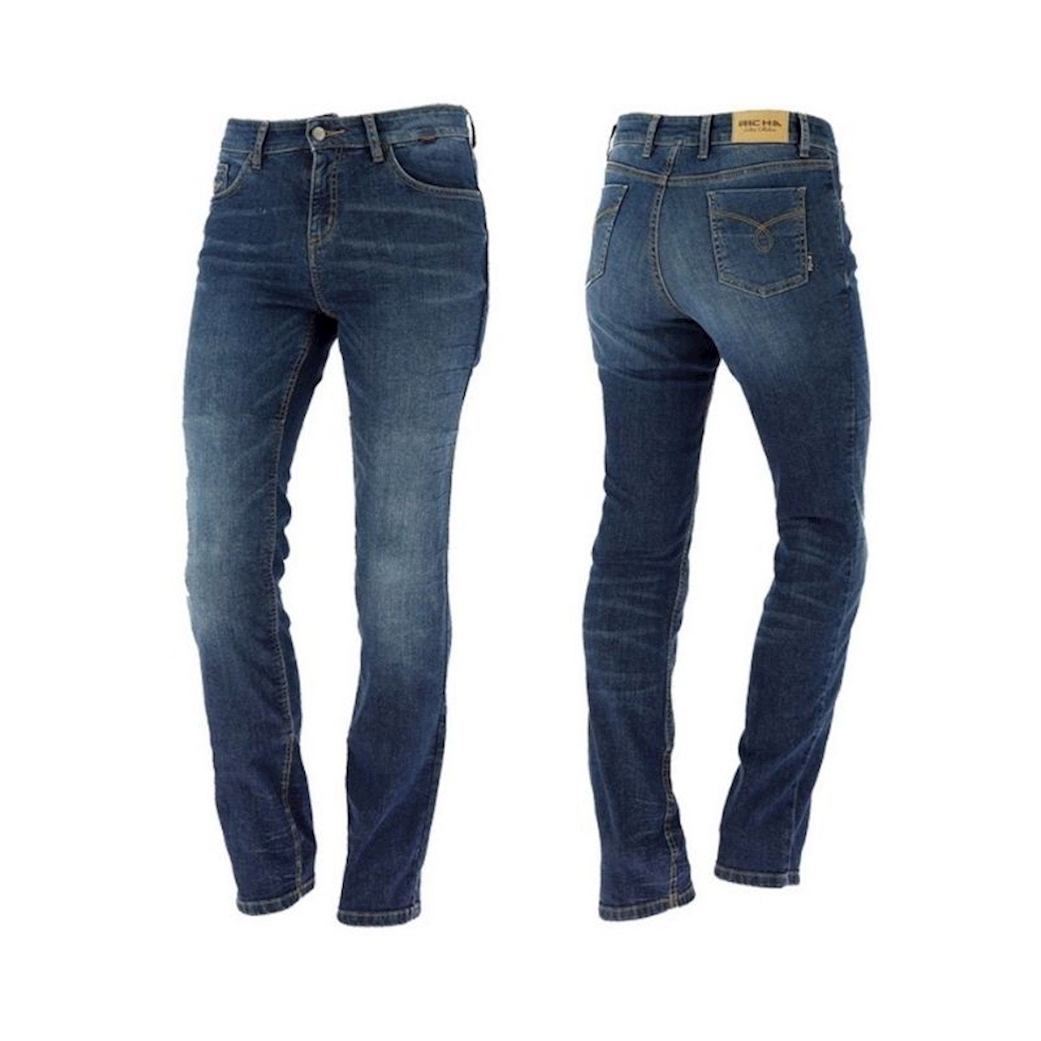 Brand: Richa Type: 5 pocket motorcycle jeans Model: Nora Jeans Fit: regular fit Colour black Closure: zipper Outer fabric material: 98% cotton / 2% elastane Material Protective Inner Lining: This product is reinforced with 18% DuPont ™ Kevlar® fiber / 82% polyester Lining material: 65% polyester / 35% cotton Size: 22 "- 48"