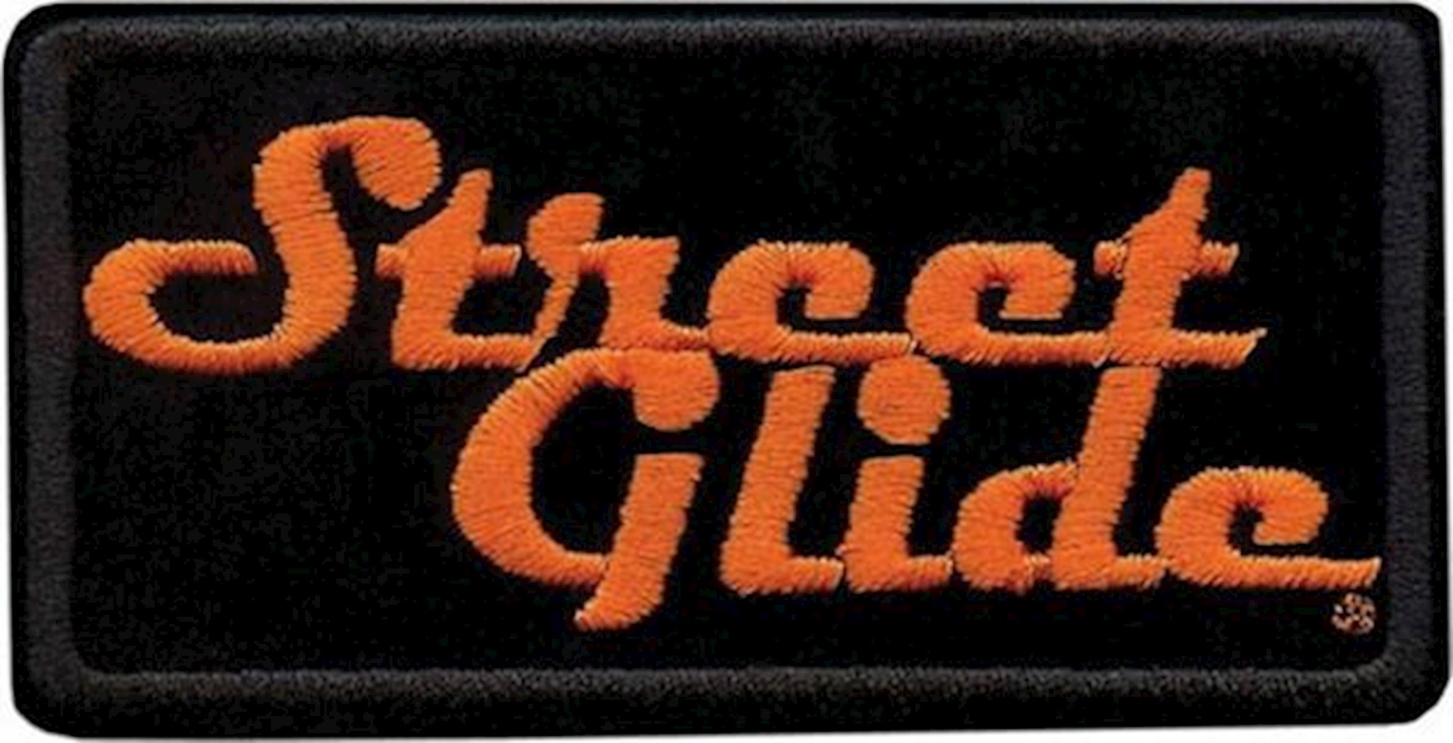 Harley-Davidson® Embroidered Street Glide® Emblem Patch, EM647062. Awesome high-quality embroidered Street Glide® script in a bright orange color. Small size patch. Size: 4'' W x 2'' H. Great looking patch to be sewn on your vest or jacket.
