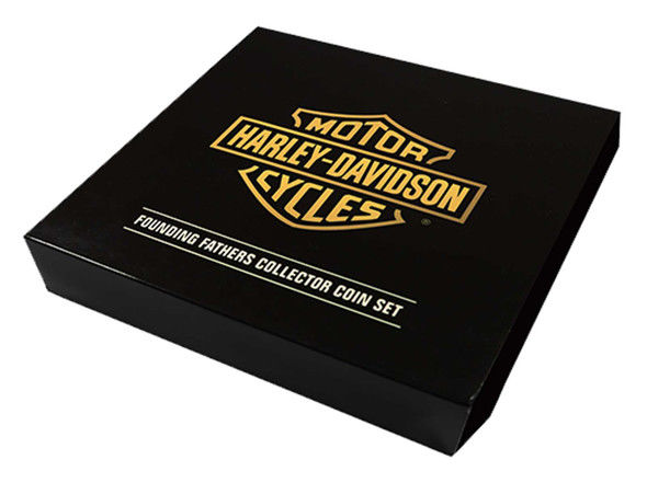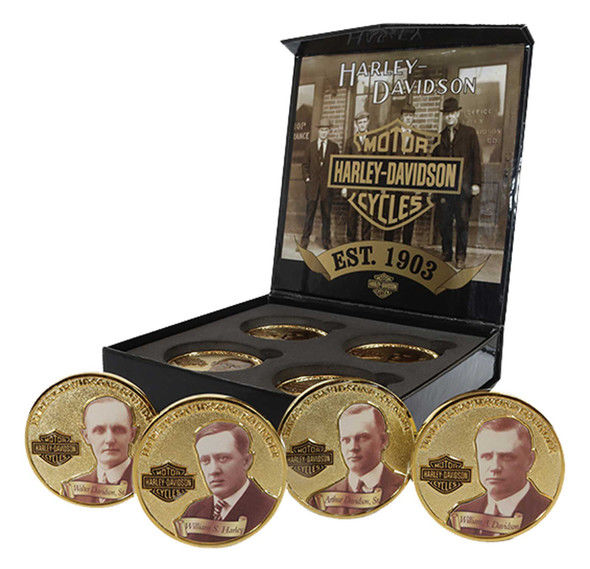 Harley-Davidson® Founding Fathers Collector Coin Set, 8014940. Box set features four gold plated, 1.75" coins with printed photos of Harley-Davidson® founding fathers William S. Harley, Arthur Davidson Sr., Walter Davidson Sr., and William A. Davidson. The coins are held securely in a laser cut foam with printing on the inside lid for attractive display. Box has a magnetic closure and comes with protective sleeve. Any die-hard Harley enthusiast won't be able to pass this collectors piece up!